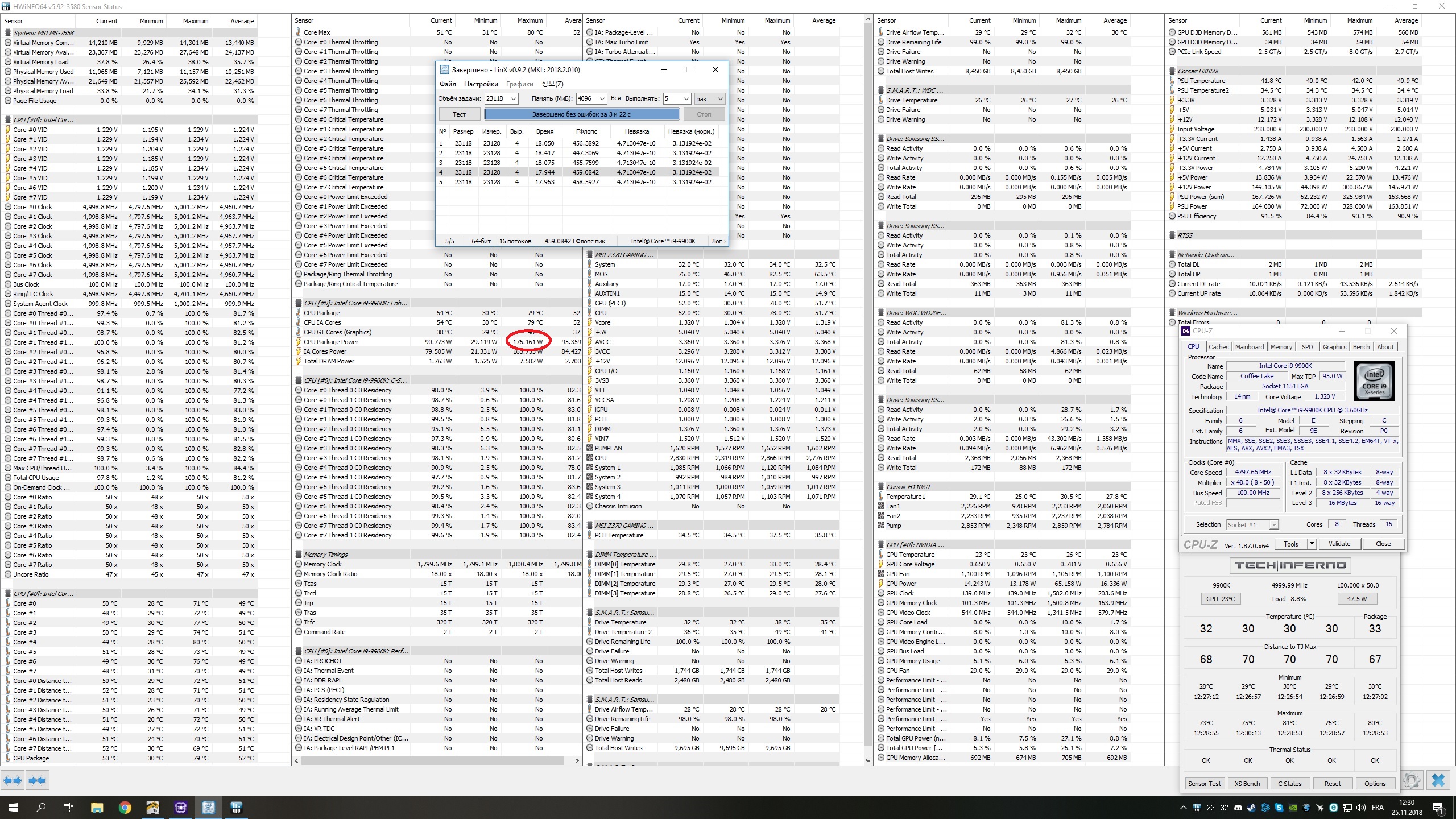 Я тебе написал все в первом предложении. Чего не понятно? У твоего разгона показатели в линкс хуже чем у разогнанного 8700к. Что ты там наразгонял я не знаю, но мой 8700k на 4700мГц и памяти 3000Мгц жрет в линксе 180+ ватт. И при этом набирает почти 400 флопсов. Твой же разгон 9900к на 4800Мгц при большей напруге на проц, всего 170 ватт. От сюда и температуры 69-79 на ядрах. Не кажется, что здесь что то не то?