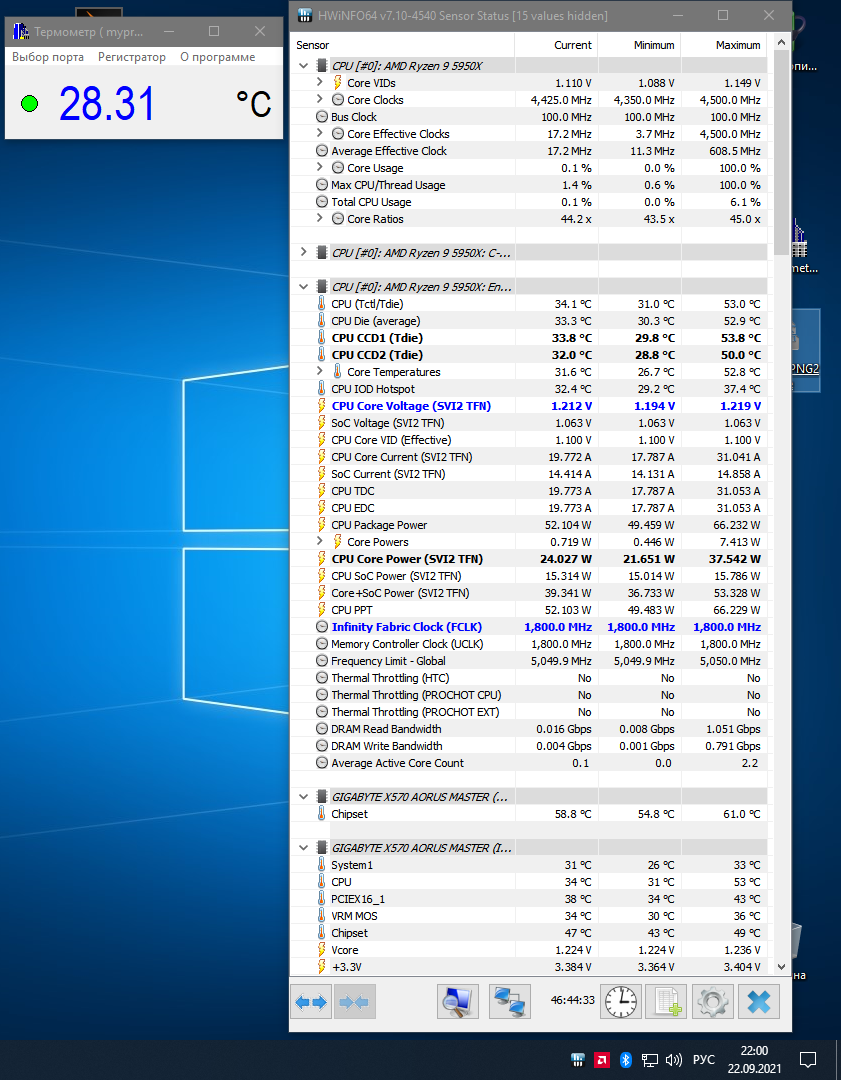 Я про это указал - нет счетчика времени HWinfo, нет просто часов - для понимания условий. Но факт есть факт - когда при минимуме 18-20 градусов температура 94, при 25 градусах будет +-100.