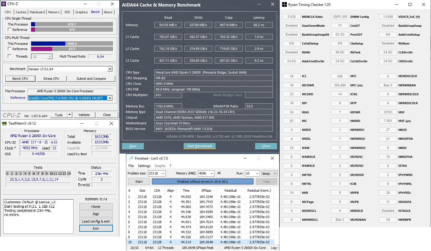 знаю несколько пассажиров в интырнетах у которых так жизнь проходит, каждый день гоняют бенчи всё какую то стабильность проверяют. Любимый здесь тест ТМ5 я тоже в гробу видел, линпак 6144 задача и 10 прогонов . По моему личному имхо и лично для меня этого достаточно, я считаю, что этот тест проверят разом всё для рядового юзера, и проц и память. Есть невязки - есть косяки, выбивает сразу или виснет ОС - ну всё плохо и накрутил вообще не туда, а ТМ5 можно месяцами память насиловать и ничего не добиться. Кстати выставил все значения из калькулятора. А теперь подробнее. У меня в голове отложилась кака, что если память сбоит то надо крутить напряжение, ну у меня и стояло с запасом 1.42 на всякий случай. Но прибывая тут на форуме я понял что я всё делаю неправильно и сбросив перемычкой настроил всё заново , только сопротивление у меня встали не рекомендованные а альтернативный вариант 3. И напряжение не 1.34 рекомендованное, и не 1.36 максимальное, а 1.365, на 1.36 была 1 невязка. Как итог всё пашет и летает. Линпак прошёл, ТМ кстати тоже прошёл, он у меня и проходил только бОльшей кровью , премьер работает, игры тяжёлые с HD текстурами выжирают под 12Гб памяти - работает. Всё. Мне больше ничего не надо. Хочется подкинуть ещё памяти, но даже если 3 планки не поедут выше 3400 то такое мне не надо, оставлю 2 как есть.