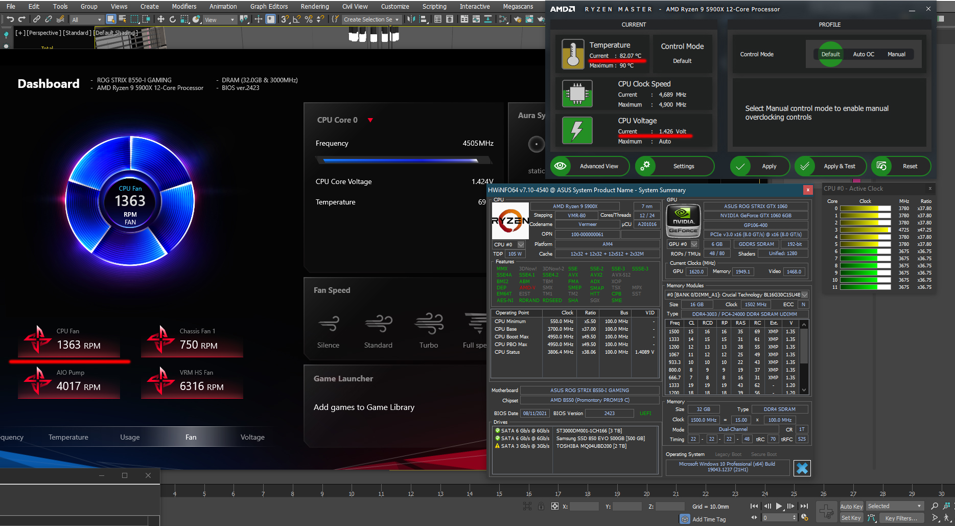 Привет. Нужна ваша помощь. Собрал себе комп, но он меня совсем не радует. Уже жалею что перешел на Ryzen. У меня процессор Ryzen 9 5900X, материнская плата Asus B550I Gaming. Проблема заключается в том, что температура процессора и вольтаж постоянно скачут. Из-за этого странно себя ведут вентиляторы. Скачут скорость их вращения. Допустим открыл ты браузер - вентиляторы крутятся на польную мощность, потом через несколько секунд возвращаются в норму, открыл еще вкладку - опять шумят, и так постоянно. Это сильно раздражает. При простом открытии сцены в 3д макс, температура проца достигает 80гр! Это супер не нормально. В простое температура процессора 55-60гр.