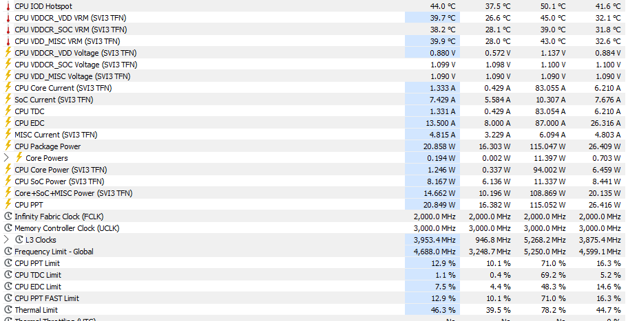 Да нет нагрузки просто тупо долюит на максимальных частотах. Походу поламались профили питания винды, что там не меняй вообще пофиг минимальное состояние 5% стоит а ему всеравно. Эти черти недавно под биос выложили драйвер чипсета 7.0 которого даже на сайте AMD нет, вот он видимо и сломал после наката на предыдущий драйвер.