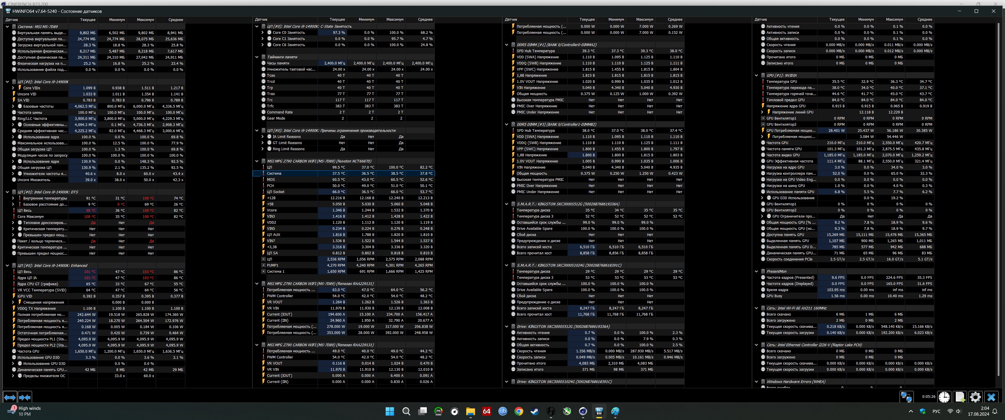 К слову, из-за неверных показаний датчика напряжений и из-за трёх БСОдов, описанных выше, я в страхе даже блок питания новый купил не так давно (MSI MAG A750GL PCIE5). Вполне хороший БП, по всем трём линиям теперь напряжения стали близки к идеалу (на скрине ниже можно увидеть). Ну и корпус за компанию поменял на невероятно красивый Montech KING 95 PRO, установив ещё три вертушки на выдув (всего их стало девять), тем самым снизив температуру ЦП и прочих компонентов градусов на пять (сам замерял). Летом точно не лишнее приобретение! Так что перегрев компонентов моего ПК тоже исключаем.