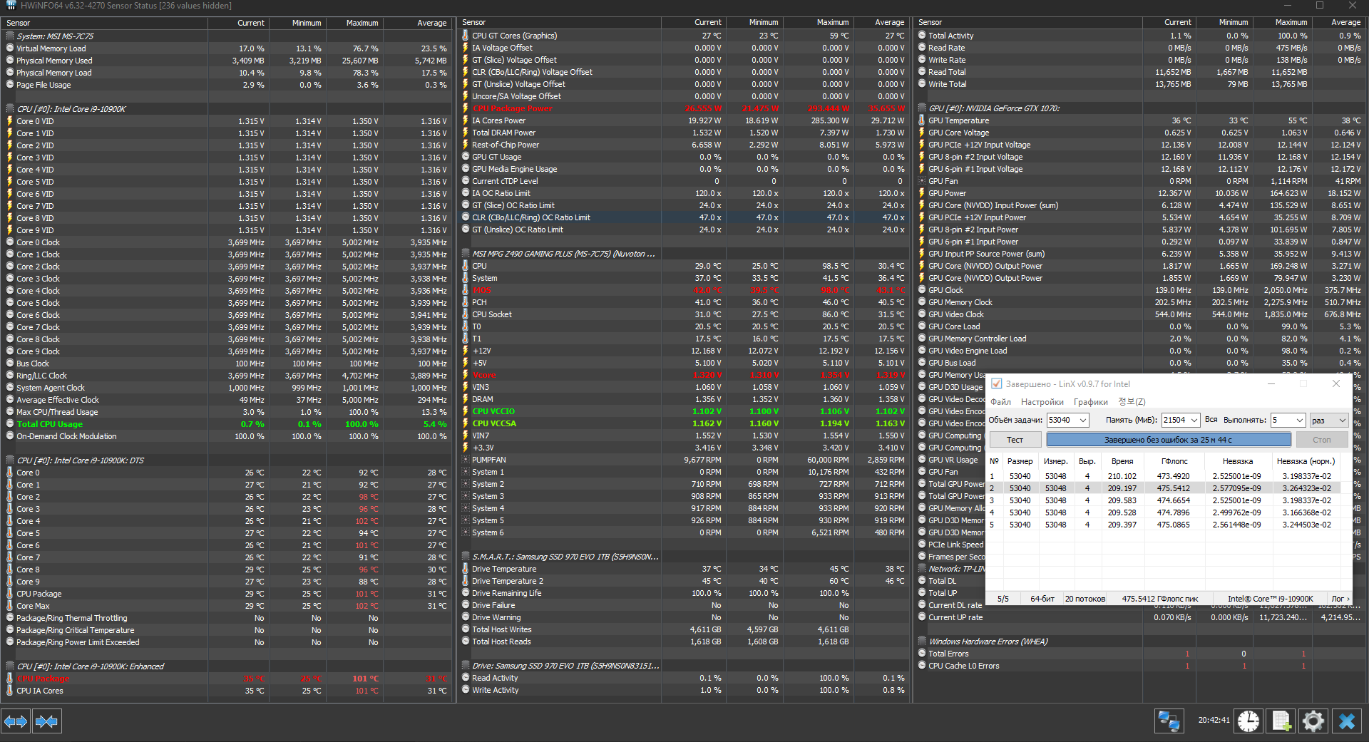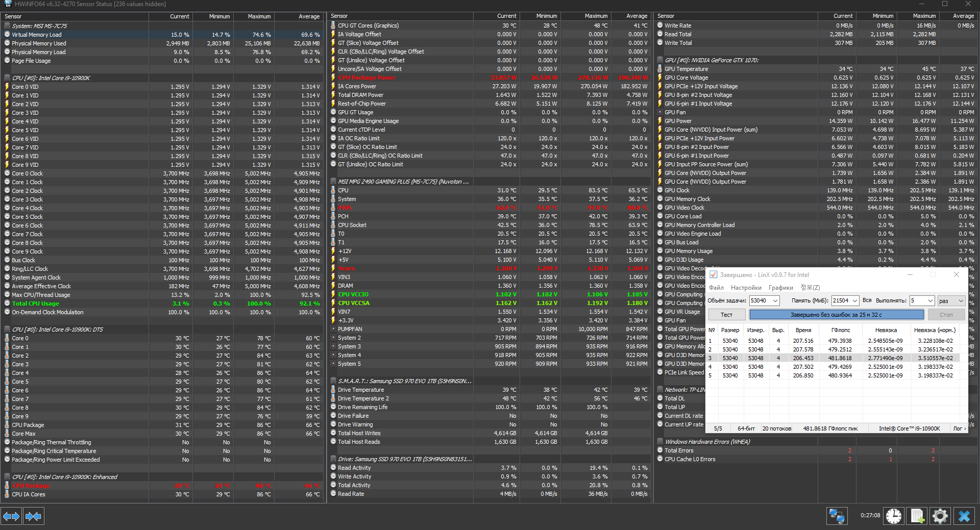 На ошибки HWinfo я внимания обращать не стал, т.к сам LinX не ругается. На варианте ПОСЛЕ напряжение было убавлено с 1,31В до 1,29В. Радиатор подключил поздно и до магаза не успел добраться, поэтому 2 оставшиеся вертушки вытащил из задней стенки компа и поставил на радиатор (они все одинаковые). Поэтому на скрине "ПОСЛЕ" мосфеты системы питания горячее. Многие скажут, что 100 градусов на мосфетах - это задница, но по опыту знаю, что мосфетам болт класть на такие температуры, как и всем окружающим элементам. На днях докуплю крутиляторы, будет легче. В состоянии покоя разница температур Радиатор - Проц составляет ~5 градусов. А по итогу LinX как видно по скринам - разница составила 16 градусов. На дня сделаю скальп, залью ЖМ, может ещё 3-5 градусов удастся сбавить. Ну и до этого, кто помнит, я писал что постоянно ловлю BSODы. Я реально думал что виноват разгон и температуры, пока просто не убрал разгон вообще всей системы. BSODы просто продолжались. Оказалось что сбоил драйвер сетевухи, который почему то вызывал проблемы в ядре (а я в свою очередь читая причины ошибки ссылался на переразгон). Так что в целом я очень доволен. Спасибо всем за советы и помощь. Теперь буду тыкаться с таймингами оперативы с надеждой выжать что нибудь из неё) Всем добра