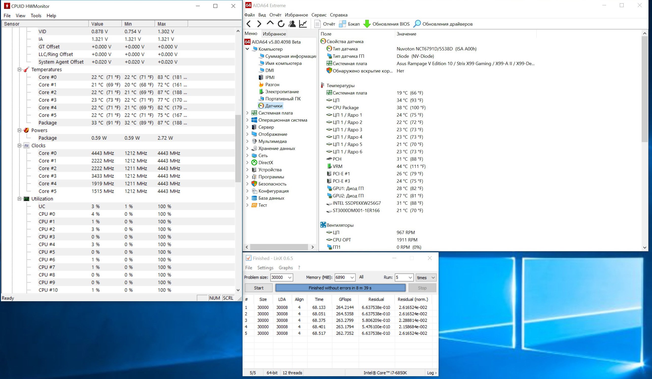 и снова прайм95 версии v25.11=) первый прогон 12 часов прошёл сразу после покупки на биосе из коробке. а после обновление биоса на asus x99 strix, спустя 4 месяца тот же самый прайм падал через 10-15минут. при этом игры всё равно не падали вообще (GTA V, BF1, BF3, BF4) чуть добавил напряжения и снова прошёл 10 часов.
