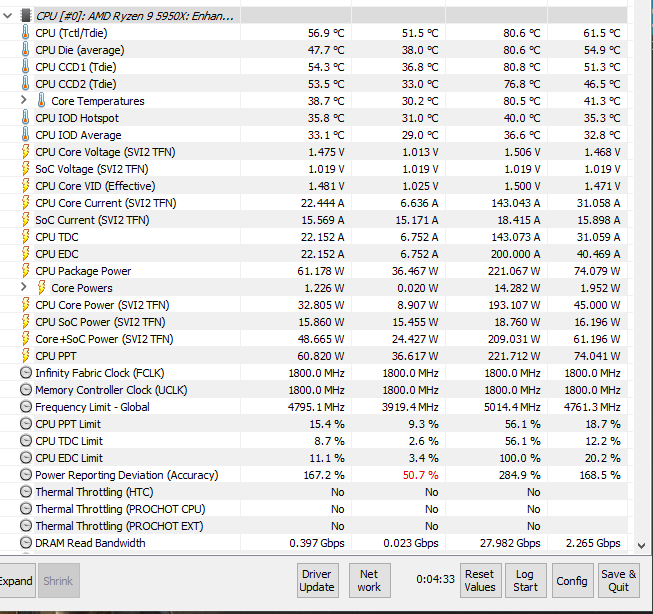 Делюсь болью и страданиями! В начале 2021 года купил я 5950X и материнку ASUS X570-I всё настроил спустя пару месяцев, радовался. Спустя пол года начались приколы, за неделю разок проскакивали ошибки WHEA Logger, по одной, потом через пару месяцев вообще критически ошибки WHEA Logger начали появляться и ребуты, причём под малыми нагрузками при просмотре видео или ютубчика, или при свёрнутой игре на паузе. После перепаковки водоблока на видюхе остались термопрокладки Gelid GP Ultimate, разобрал материнку, поменял термопрокладки на VRM, на обратной стороне VRM и на чипсете и вуаля, всё как рукой сняло. Напряжения CLDO VDDP, VDDG IOD, VDDG CCD получилось снизить до старых пределов. Какая связь между WHEA и охлаждением материнки я ХЗ. Но изначально начало помогать тупо обдув вокруг сокета 120мм вентилем. Теперь и без вентиля работает. Посмотреть бы на материнку в тепловизор.