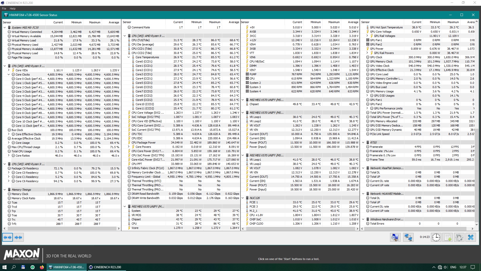 Здравствуйте. Приобрёл себе Ryzen 5900x - к сожалению, неудачный камень мне выпал в "силиконовой лотерее", но теперь ничего не поделаешь. Не стартует ни в какую с любой IF выше 1867МГц. Хотя его "предшественник", Ryzen 3600, запускался и с IF=1933МГц (другое дело, что он с памятью нормально не работал в этих условиях, но это уже другая история). Поэтому никаких рекордов от нынешнего процессора я не жду, просто зафиксировал частоту ядер на 4600МГц, материнка автоматом выставила все напряжения. (На 4700МГц уже не справляется СО процессора в стресс-тестах AIDA64). Вот скрин HWiNFO64 после стандартного 10-минутного прогона Cinebench R23: