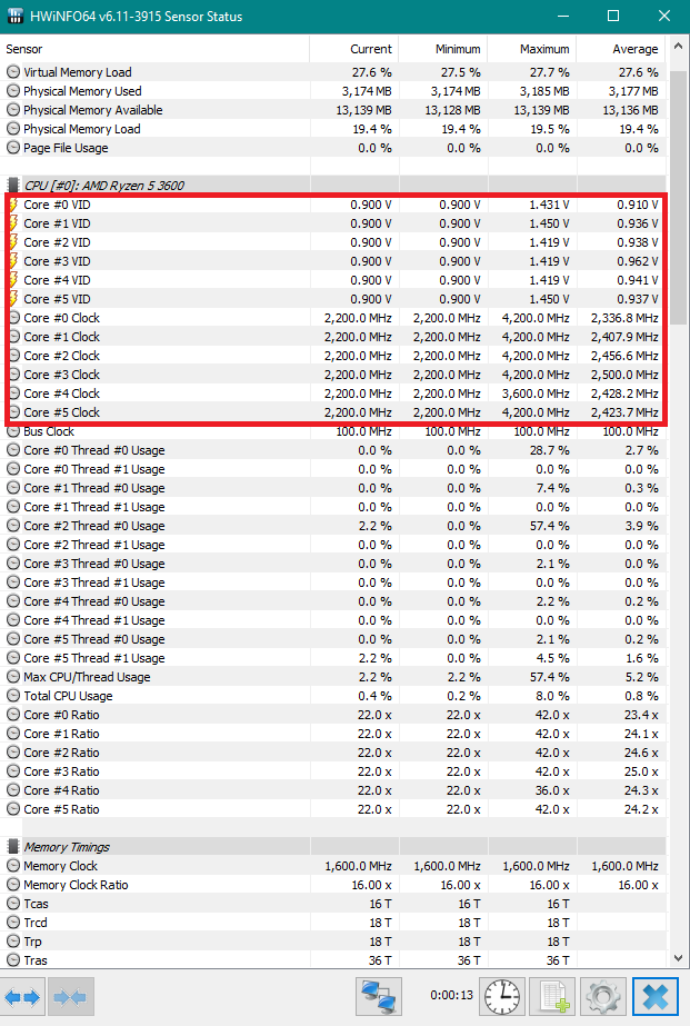 У меня проц в режиме Ryzen Balanced или просто виндовый Сбалансированный, ниже 3600 не сбрасывает - это минимально заявленные частоты. Но при энергоплане Сохранение Энергии - вот вам скриншот, который выше. 2225мгц по всем ядрам, 0.9В.