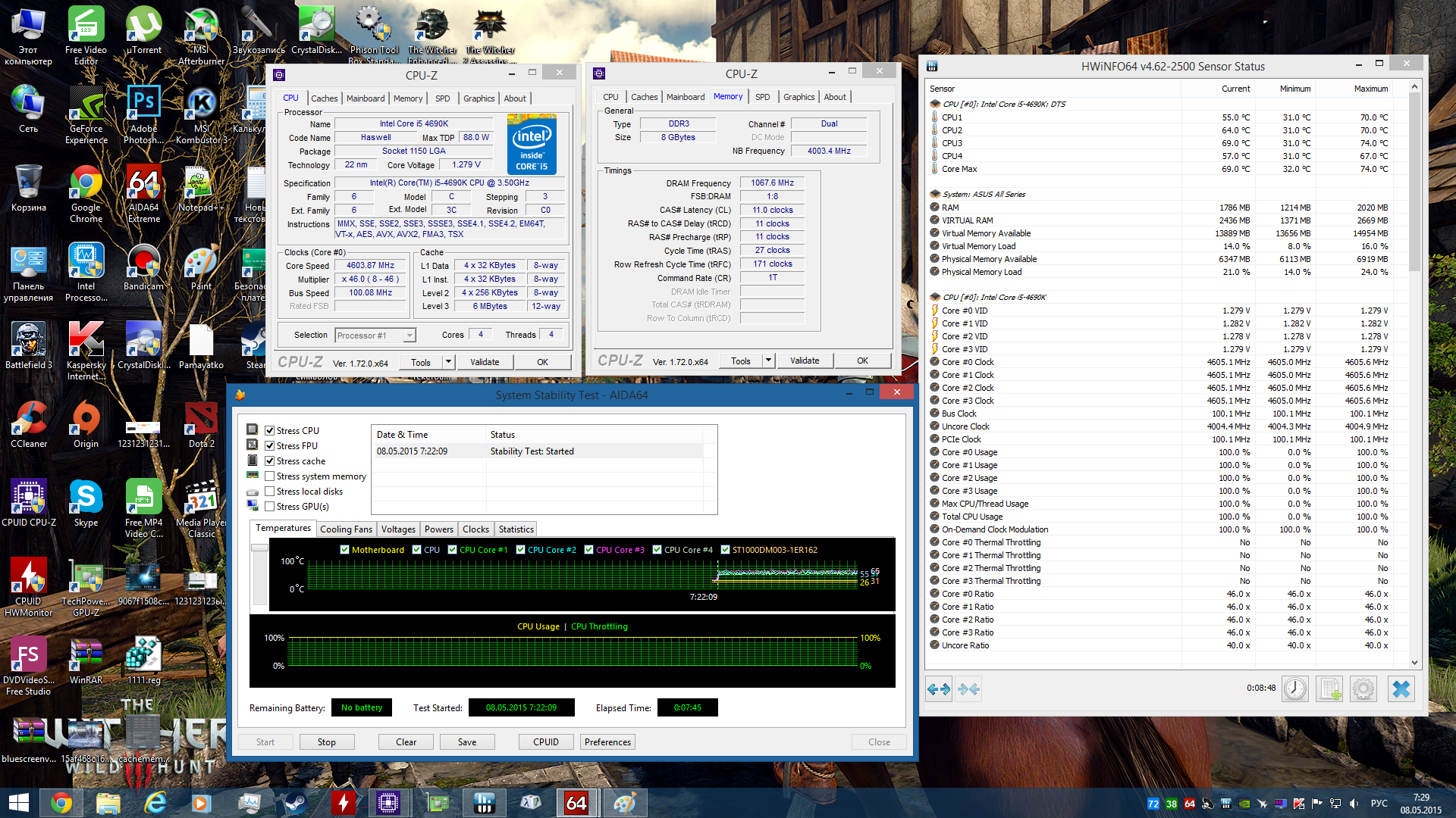 Думал что 4.8-4.9 легко возьмет на 1.35-1.4..., думал лучше i7 погонится HT же нет, а так не о чем, даже скальп не буду делать... Поставил 4.6 на 1.28, вылетов пока нет, в батле темпа выше 52°C не поднимается, память еще до 2400 погнал. Пусть хотя бы так, чем никак