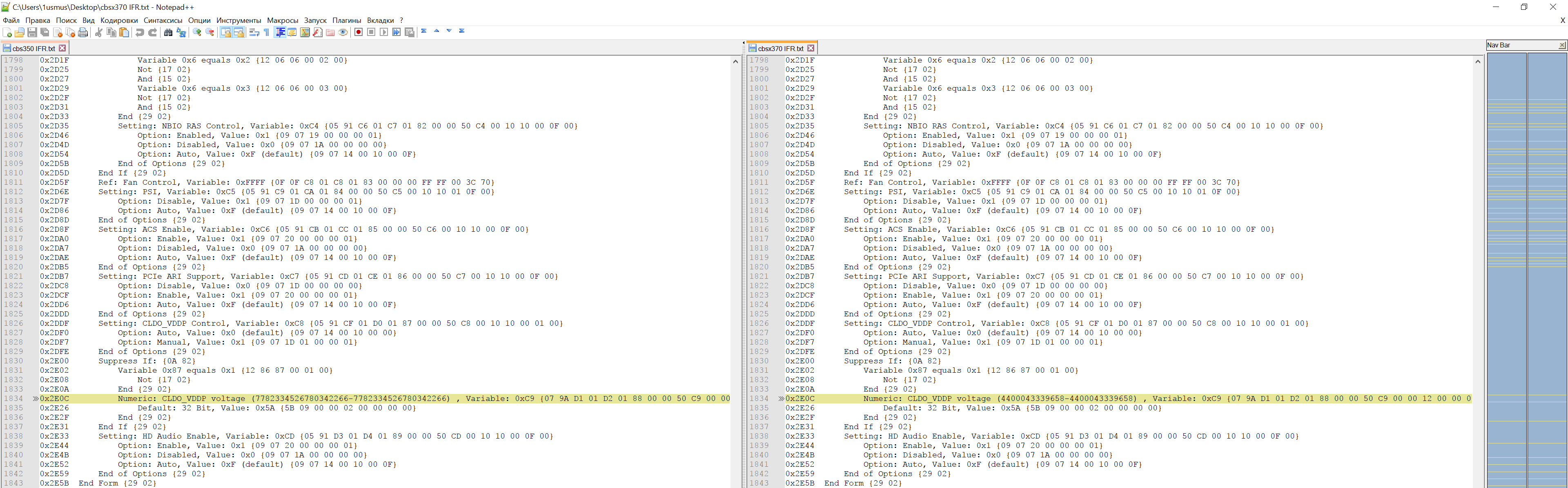 Ну текстовый как бы нет смысла редактировать он чисто для читабельности, а в hex различий вовсе нет. Я пробовал мамке скормить биос с файлом от x370. Изменений 0