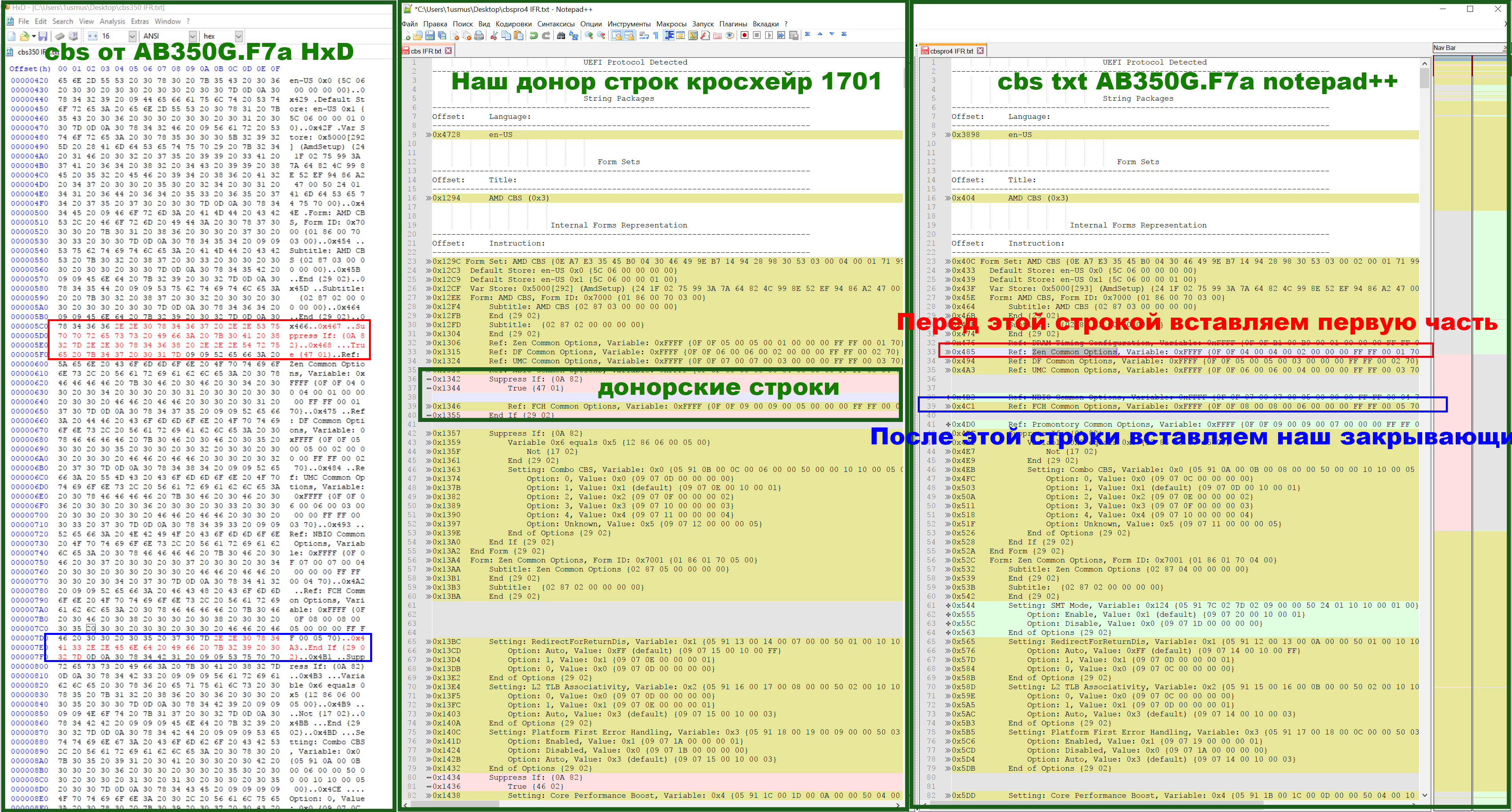 Имеем донора строк кросхейр с биосом 1701, в будущем он нам не интересен и не нужен будет, нас только волнует вытянутое с него ..Suppress If: {0A 82}..0x468 ...True {47 01}.. и ..End If {29 02}.. . Это открывающий и закрывающий кусок кода. У каждой строки биоса есть свой номер, много строк оставили резервными, вот в них и будем мы помещать наши куски кода. В биосе для гигабайта есть строка ..0х466 Zen Common Options обзывается ..0х466 , вот после нее мы должны вставить нашу первую часть кода ..0x467 ..Suppress If: {0A 82}..0x468 ...True {47 01}.. затем ищем закрывающую строку которая имеет писанину FCH Common Options ее номер ..0x4A2, вот после нее мы дожны вставить наш второй кусок кода ..0x4A3..End If {29 02}..