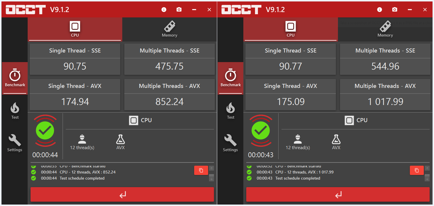 Ниже три теста - CBR23 (SC и MC), 3DMark CPU Profile и OCCT benchmark (для проверки стабильности в SSE и AVX) Сравнивал со своим 24/7 конфигом и фиксом 4400. В СBR23 - сравнение с дефолтом (single core ~ 1540) и фиксом