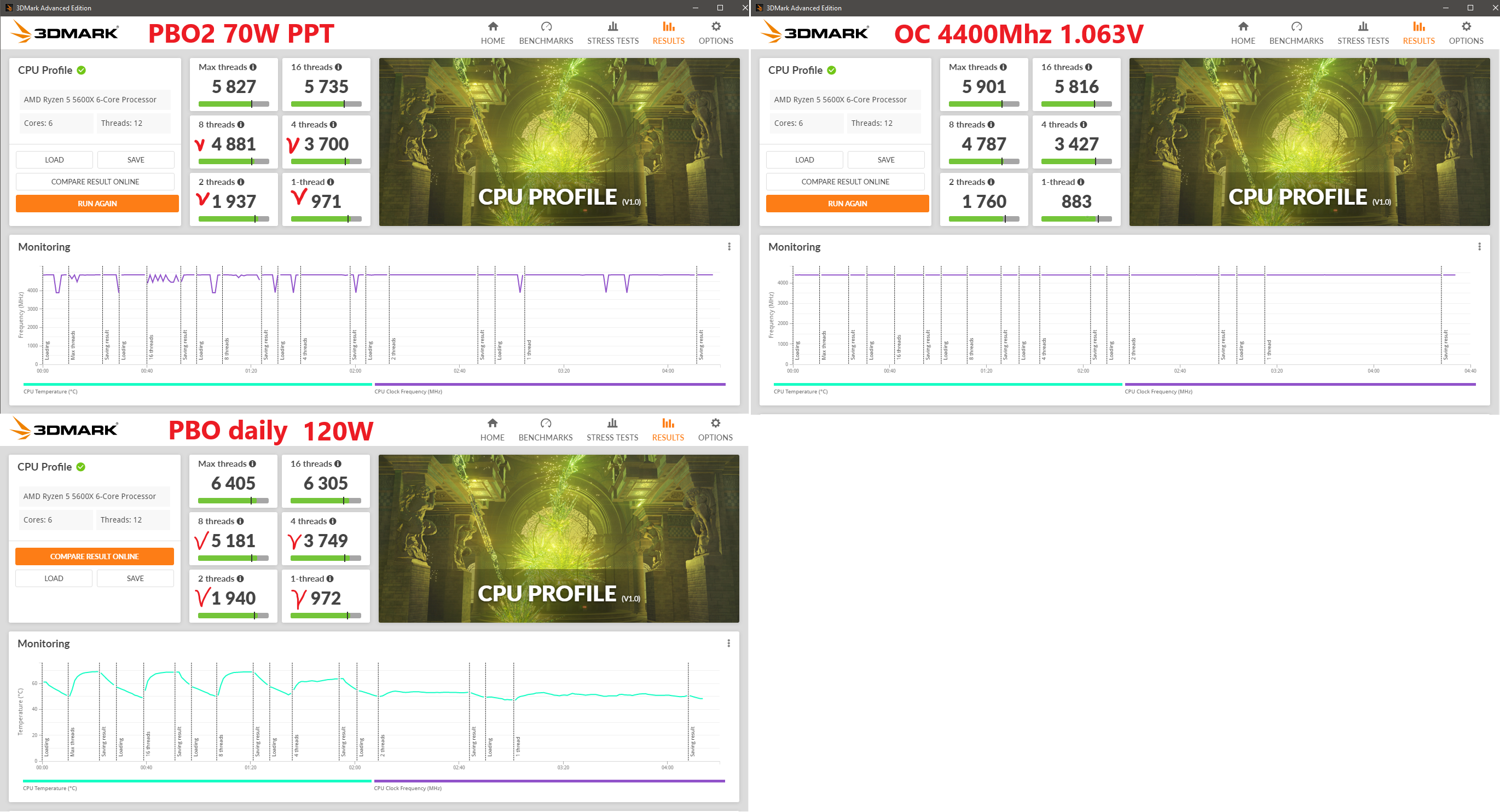 Добавлено спустя 12 минут 43 секунды: PS: Касаемо, для чего там 3DMark CPU Profile (кто то спрашивал, нафига, мол он нужен), Этот бенч гоняет проц задействуя от 1-го до 12-ти потоков (в случае 5600Х), эмулируя различную игровую нагрузку, которой больше соответствуют 4 и 8 - threads тесты.