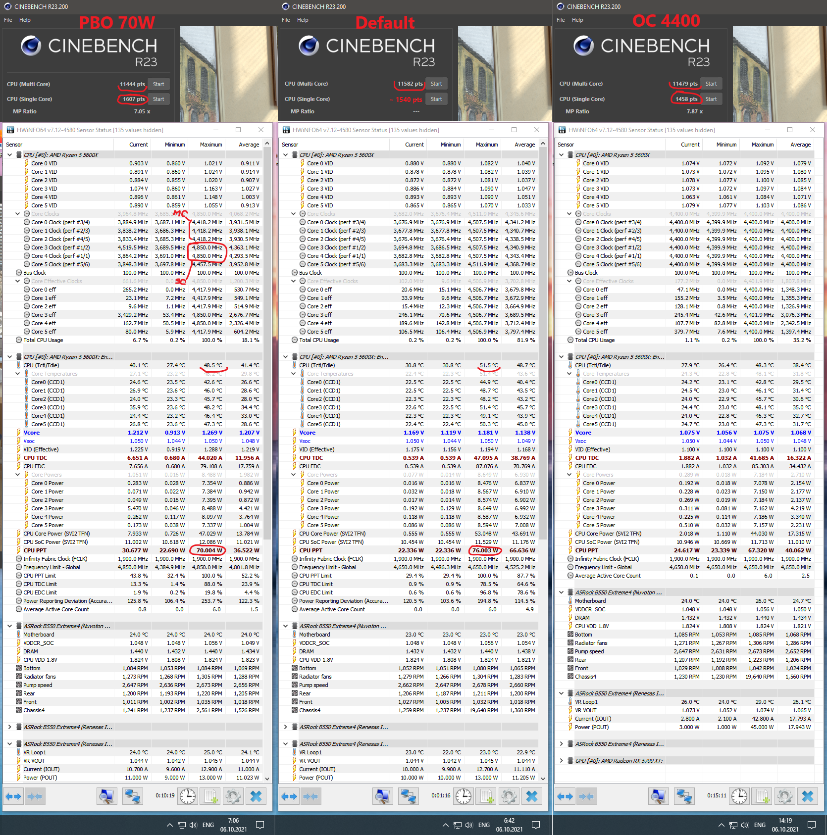 Т.е. все что я изменил в рабочем конфиге, это снизил PPT co 120W до 70W, и поправил кривую CO на ~ 8-10 пунктов в минус. При этом +/- схожие рез-ты с фиксом 4400 в тяж. нагрузках, и никакого падения в малопоточных. Надеюсь на скринах все понятно. В дефолте CBR23 чуть лучше за счет непрогретого компа, при равных темп. рез-т не хуже точно.