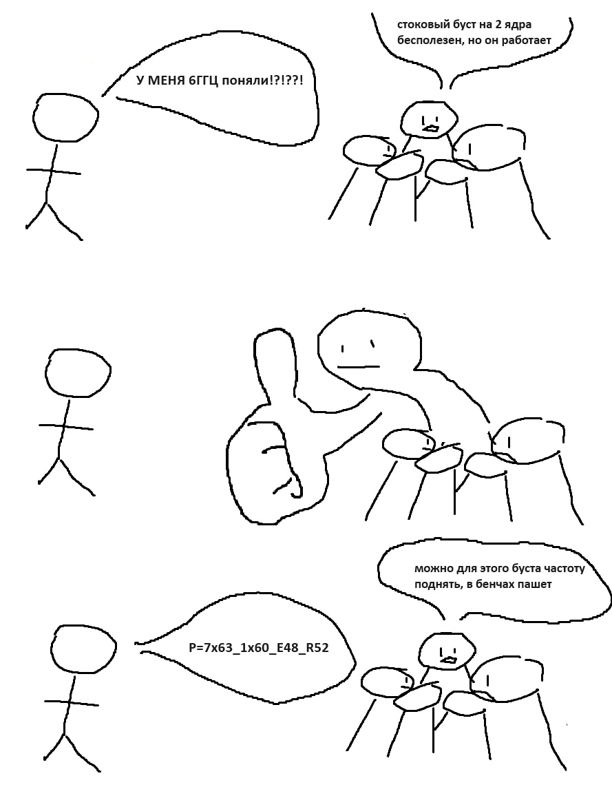 обсуждение было: где и как работает буст по числу активных ядер? приходишь ты: "у меня 6ггц нафиг ваши бусты, частоты детские" На аватарке напиши еще, а то вдруг кто-то не знает.