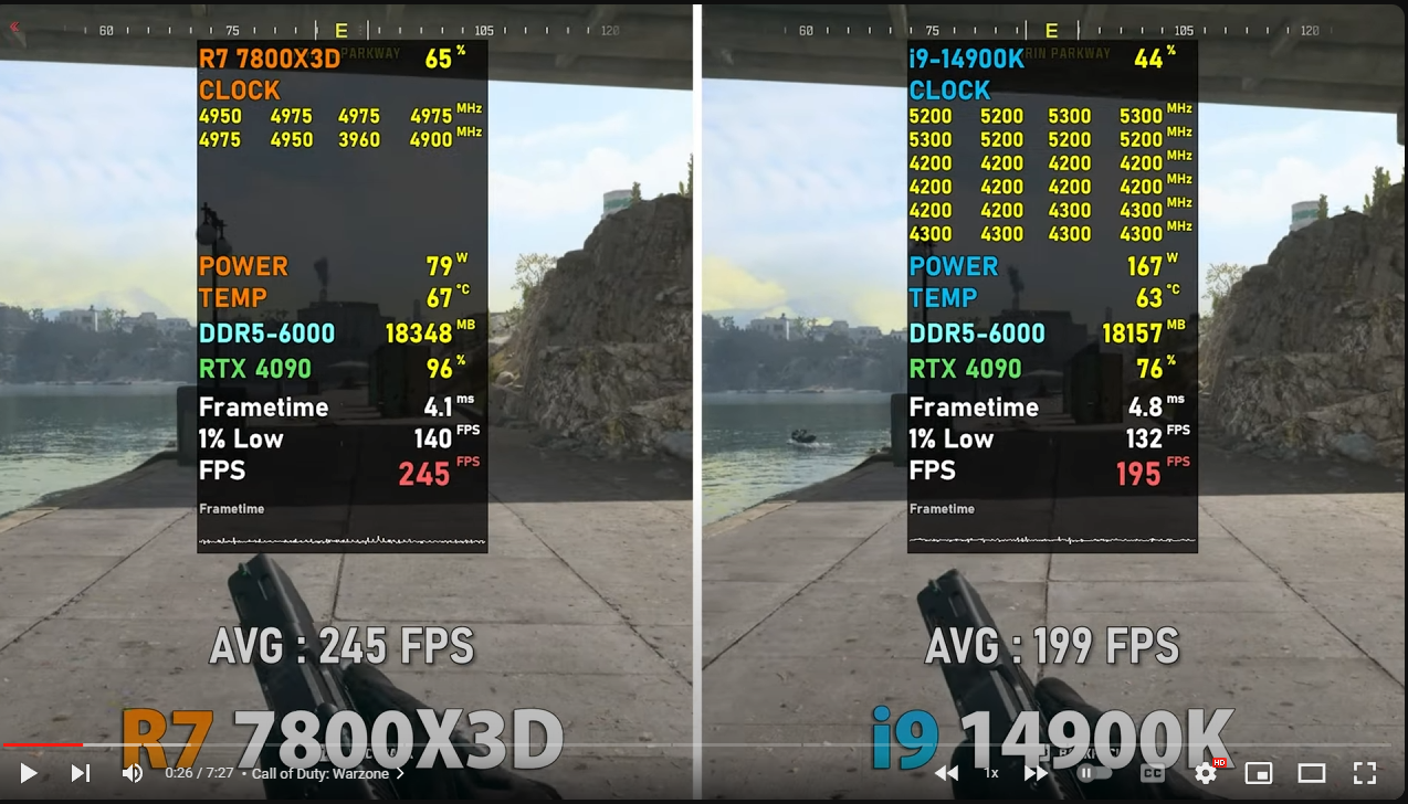 Или здесь 7800х3д 245фпс и интел был разгромлен со 199фпс. А просадки то у обоих до 1% 130 фпс. Ну и какой смысл в амд? Смотреть эту дерготню как фпс шакалит постоянно от 250 до 130?