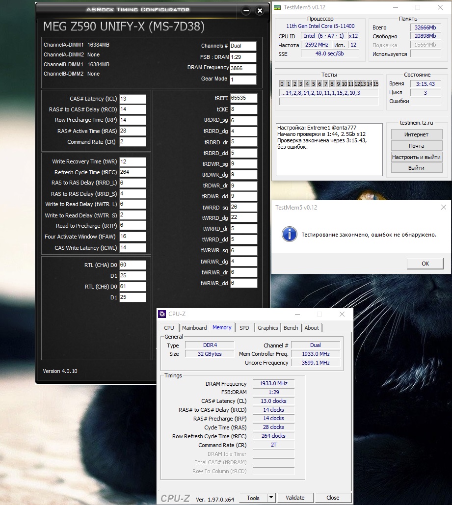 Вот с проходом одного цикла Extreme1 Anta777 - 3733 Мгц 16-16-16-32, 1.5 В память, SA 1.37 В, IO2 1.37 В, LLC4. Дальше я уже не стал ждать.