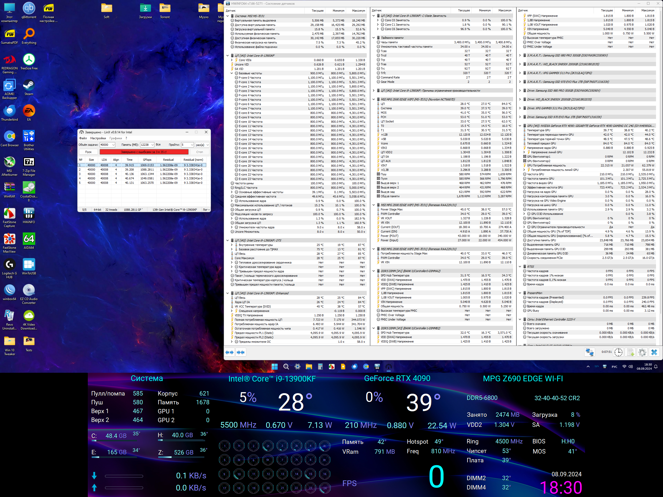 Жду летний скрин Linx на задаче 40К со снятыми лимитами. Покажите что вы смогли "в думать" чтобы смочь в 4095 ватт при обычной летней погоде (+25 за бортом). Я конечно же имею в виду 13900К/14900К с заводскими настройками по ядрам. Не надо мне тут 13700 выкладывать (или 13900К + память с jedec 5400).