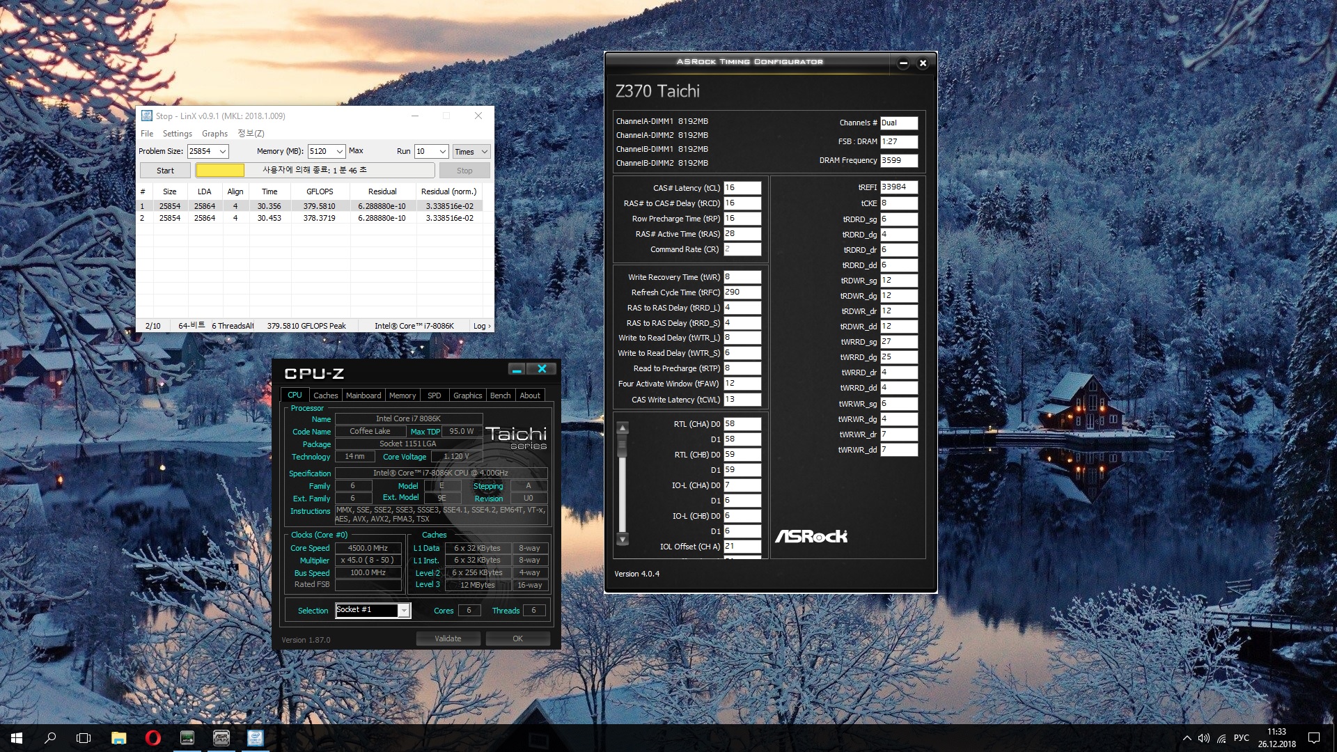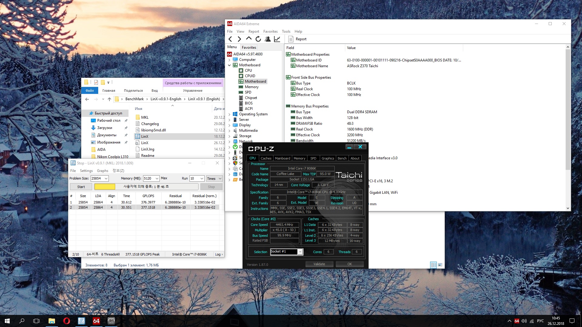 Полученный результат должен иметь следующий вид: Скриншот рабочего стола после прохождения >9 циклов (т.е. между 9 и 10 проходами). Вместе с LinX на рабочем столе должны быть развернуты CPU-Z (первая вкладка) и Core Temp, это обязательный минимум. Такой набор программ даст информацию о напряжении и температурах под нагрузкой-простоем. По желанию можете добавить другие программы, показывающие дополнительную информацию о вашей системе, например третью вкладку CPU-Z, которая покажет модель материнской платы и версию BIOS. Пример результата разгона: Mad Max, 5100 МГц (AVX 0), i7-8086K, HT-ON, Cache 4700, Vcore=1.36V, Batch L805E123, Gigabyte Z370 Aorus Gaming 7 (bios F6), Be Quiet! Dark Rock Pro 4, ЖМ под HS, Windows 10 Pro 64-bit 1809, LinX 0.9.3 64bit.