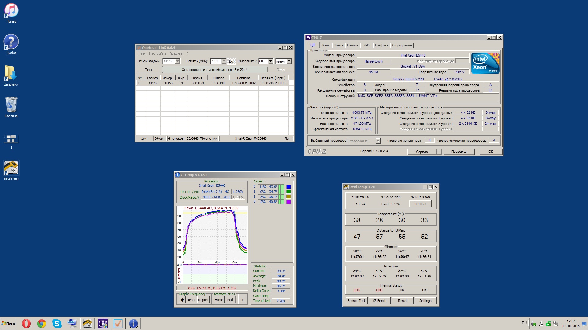 Поставил E5440 (E0) на Asus P5K3 Deluxe. Пока удалось взять стабильных 3800 при 1.32V. При 4 гигагерцах и 1.4V Линпак стабилен, но температура уходит за 95 градусов (кулер TT BT). Буду что-то делать с охлаждением (пропайка основания, замена вентилятора).