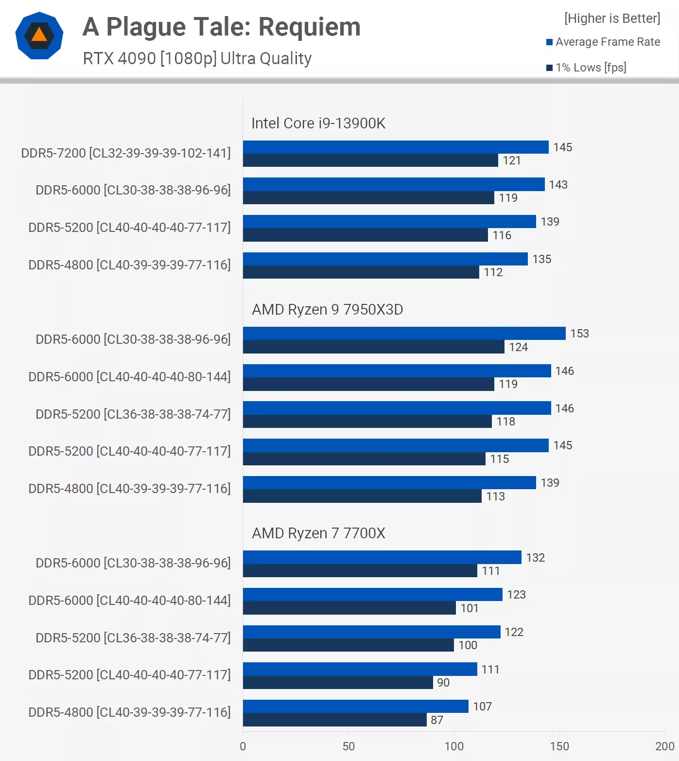7700х, A Plague Tale: Requiem при переходе с памяти DDR5-5200 на 6000 Cl30 прирост почти на 20%