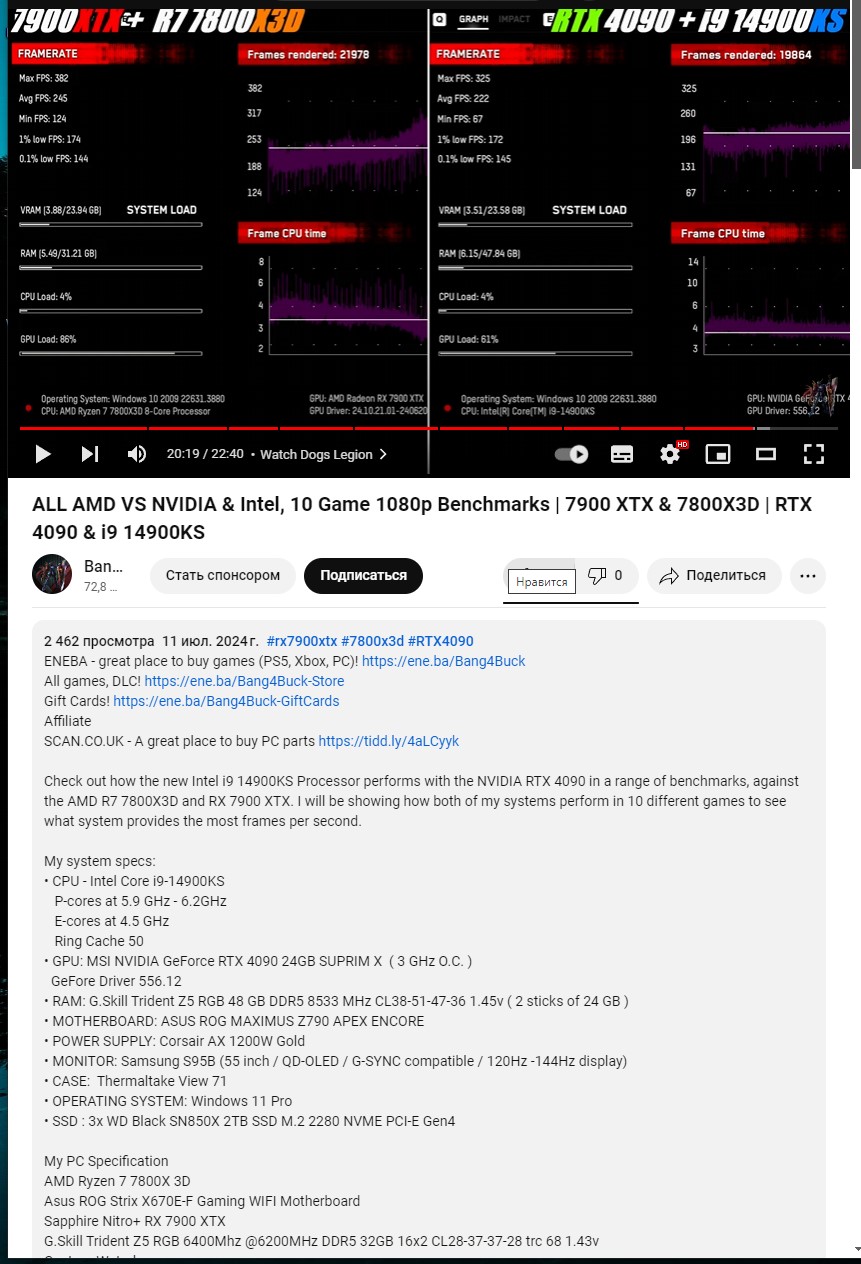 Просмотри еще раз (внимательно)! У чувака смешанные настройки, на low только то за что отвечает ГП и память ГП: графика, текстуры, тени, отражения. Ну ок, у него есть еще видос: 7900 XTX & 7800X3D | RTX 4090 & i9 14900KS, там у i9 память 8533 и с теми же настройками всего 222 fps (оч. странно), тогда как у 7800X3D 245: