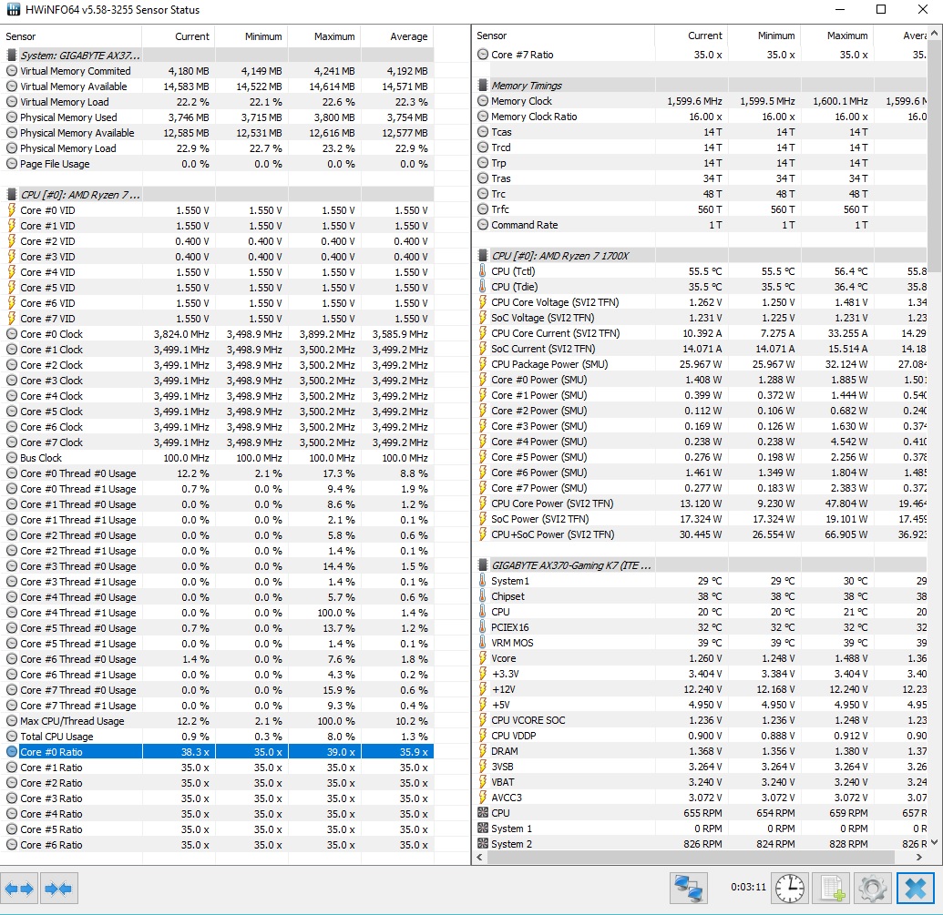 - Обычно поставляется в коробке с системой охлаждения Wraith Spire RGB (это круглая конструкция из целого куска алюминия с медной вставкой-испарительной камерой в основании и вентилятором с кольцом разноцветной подсветки, крепится к задней пластине разъёма AM4 четырьмя винтами). - Штатно имеет базовую частоту 3.0ГГц, частоту 3.2ГГц (технология Turbo Boost) при обычной многопоточной нагрузке (Blender n-cores render) и 3.75ГГц (технологии Precision Boost и XFR) при однопоточной нагрузке (Cinebench R15 single core). - Штатное напряжение питания 1.1875В. Может возрастать до 1.3В на отдельных ядрах во время работы Precision Boost и XFR. - Очень энергоэффективный, требования к СО (TDP) - всего 65W. Энергопотребление порядка 10Вт в простое и 85Вт в обычной многопоточной нагрузке (Blender n-cores render).