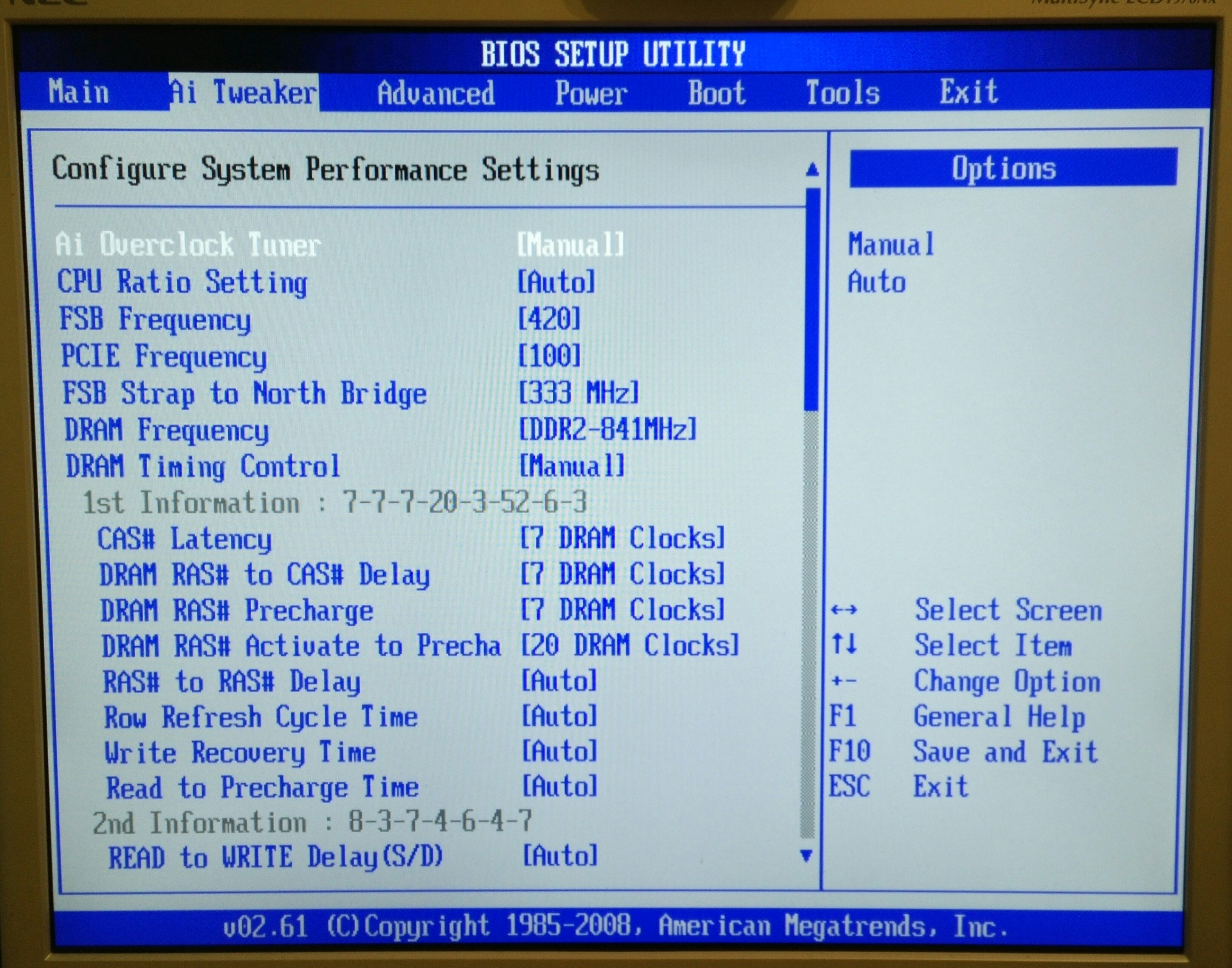 А в авто что МП ставит по памяти ? На край попробуйте что нибудь навроде 6-9-9-26 в AI Over разделе лучше все ручками выставлять - потом плавно повышать ища баланс между CPU Voltage и PLL Voltage. Вроде до 2х и без радиаторов DDR2 работает =).
