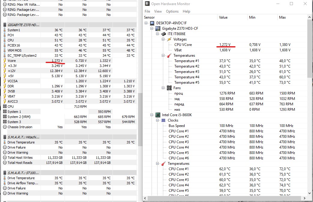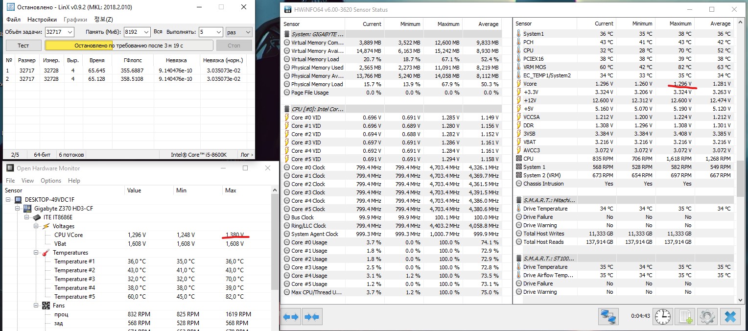 Привет народ. а нормально при разгоне 8600к до 4.7 в LinX 0.9.2 напруга скачет до 1.47? в нагрузке выше 1.32 не видел, но бывают редкие прыжки до 1.38-1.4. мать гига z370 hd3. vCore стоит на normal; dvid +0.01; vcore llc=high; vavx llc=standart. больше в биосе ничего не крутил. заранее спасибо.
