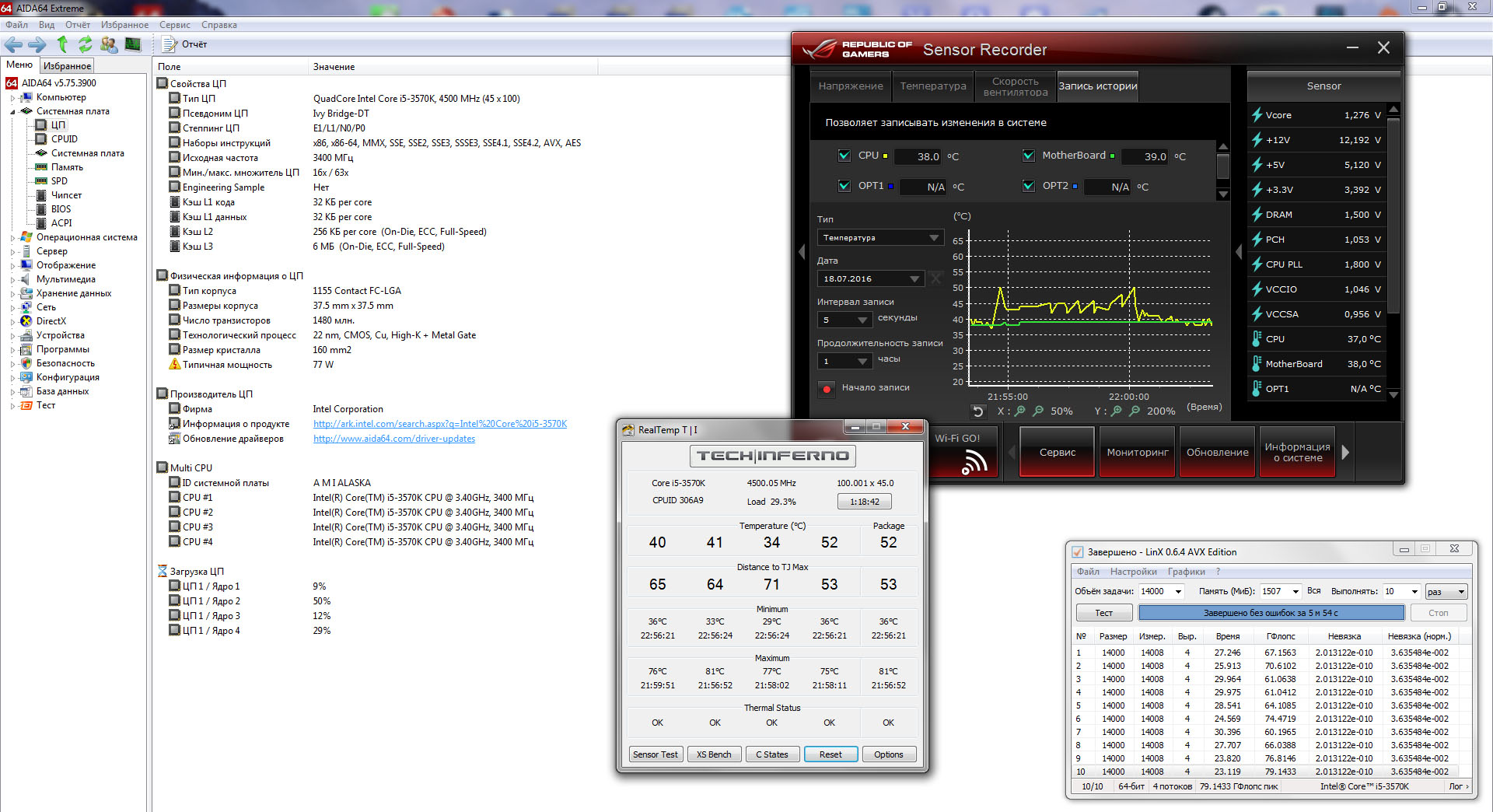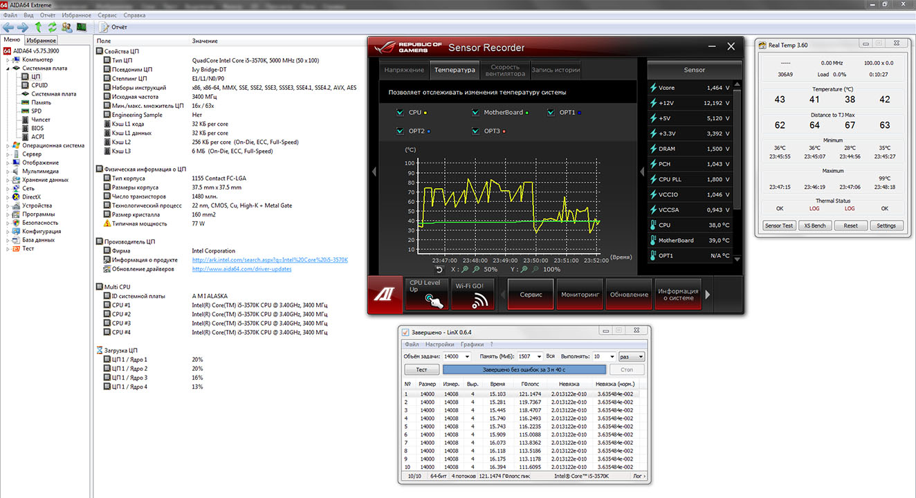 WhiteGhost85, и еще забыл сказать, тест LinX проводился скорее всего без поддержки AVX, т.к. кол-во Гфлопов очень мало, и должно быть в районе 120. В любом случае, показатели очень низкие и с большим разбросом, что говорит о нестабильности процессора. Если это так, то реальная температура должна быть выше градусов на 10.