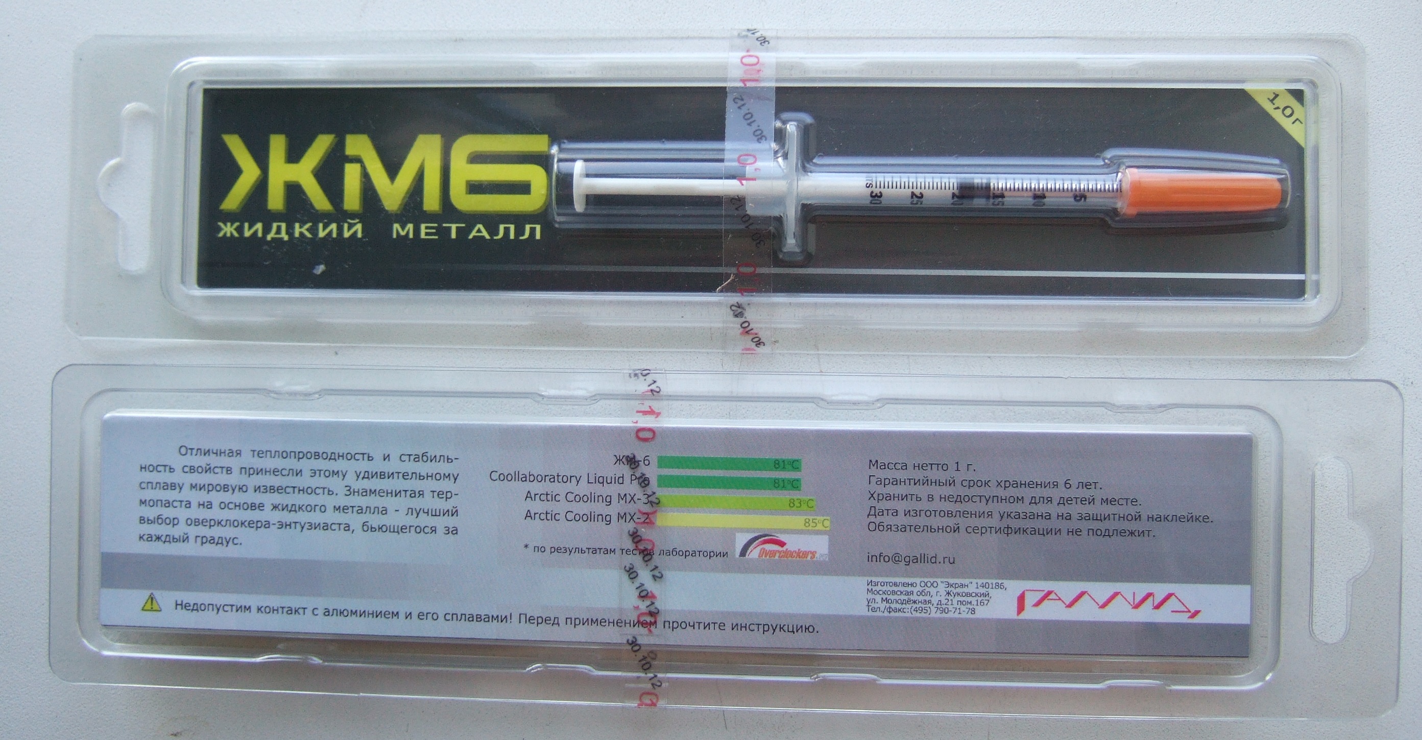 Про компанию или сайт Gallid информации вообще нет. Но когда заходим на сайт ООО "Экран" в г.Жуковском все становится сразу понятно : http://www.screen-co.ru Теперь, да я вполне допускаю что разницы между Liquid Pro и ЖМ-6 Вы и не увидели, потому что вполне возможно ее просто нет Ну а дальше все понятно, есть Патент и есть правообладатель, а дальше как говорится "Ромео должен умереть" Я допускаю что 34 Вт/М*к - вообще от балды, чтоб не было много вопросов. Но тесты - предательски выдали такое чисто случайное совпадение. Да и на упаковке ни слова о теплопроводности, но везде где упоминался ЖМ-6 почему то пишут 34 Также вполне возможно что 34 Вт/М*к - это как раз реальная цифра, а вот 80 Вт/М*к от Liquid Pro - это теплопроводность допустим при абсолютном нуле или еще при каких особых условиях о которых производитель скромно умолчал. Ну в любом случае, ЖМ-6 уже давно нигде нет и информации о нем в открытых источниках нет, лишь отзывы и воспоминания пользователей. Так что всего 2 претендента на абсолютное лидерство старичок Liquid Pro и новичок Grizzly Conductonaut