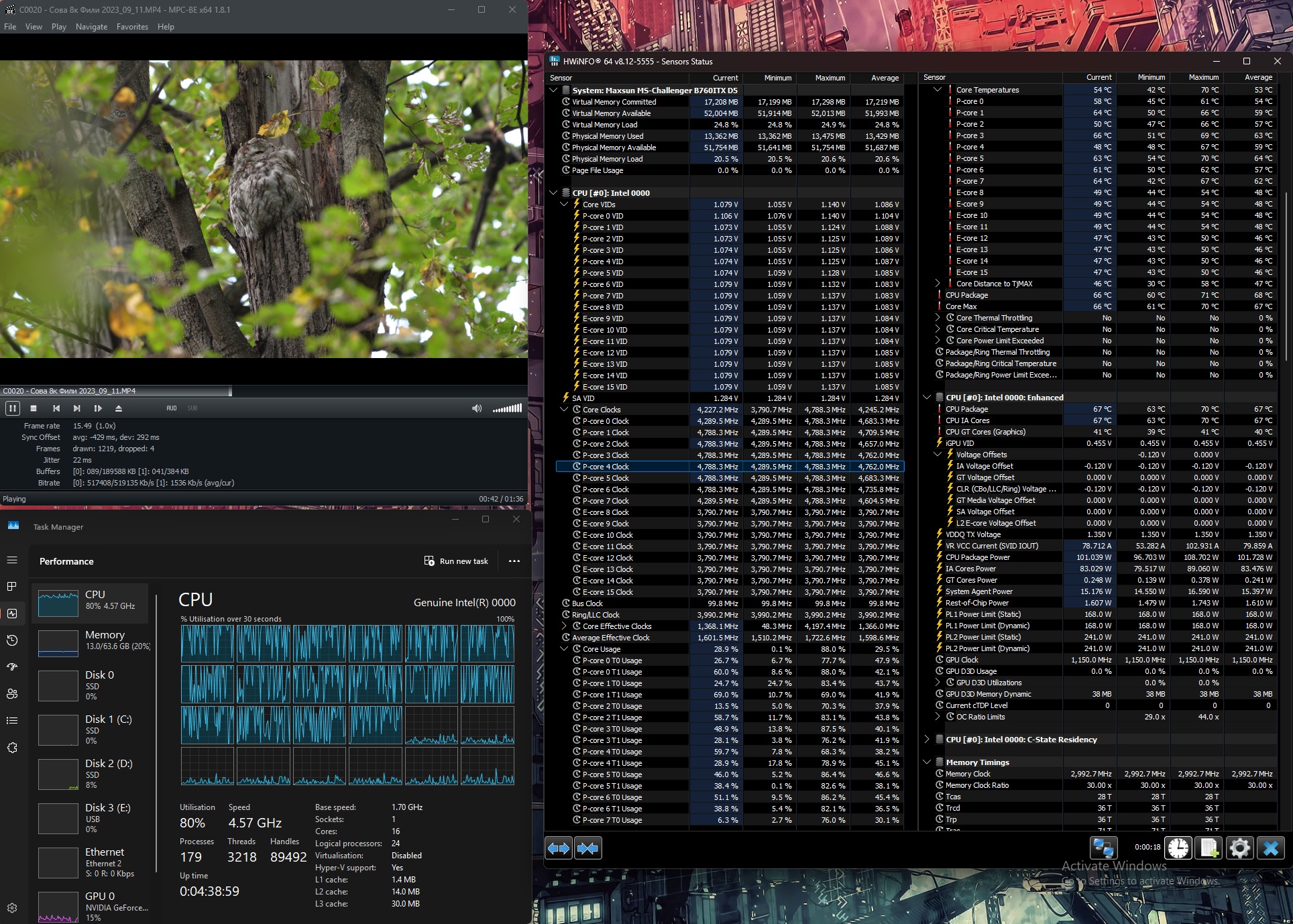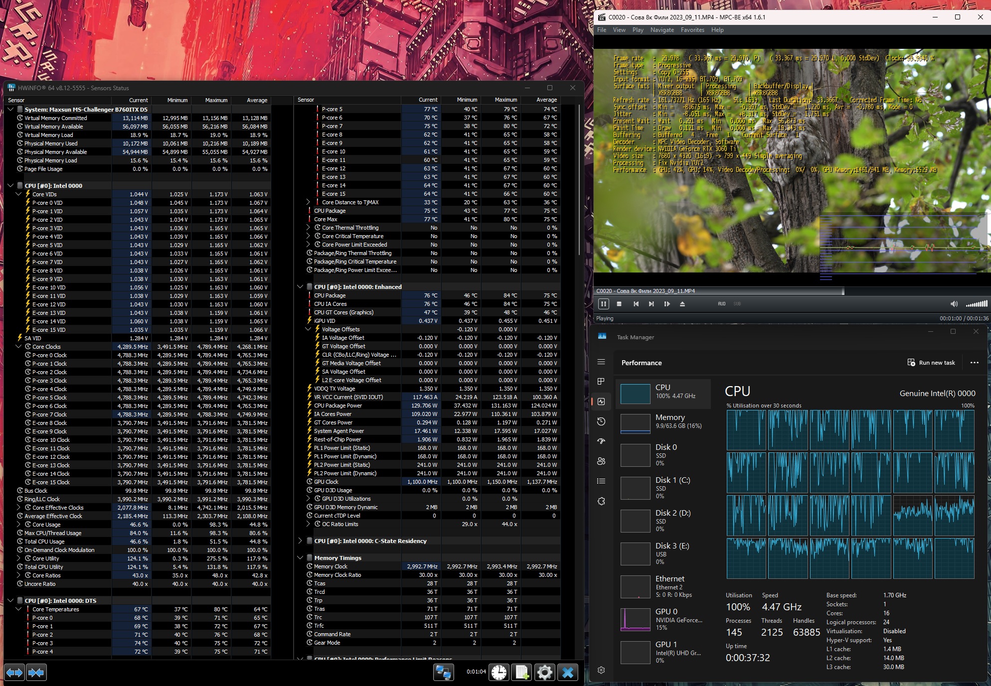 Тестовое видео в 8к 4:2:2 10 бит положил тут. Это ролик длительностью 1.5 минуты, весом 5.84 Гб. Воспроизводил при помощи MPC-BE x64 версии 1.6.1.6845. 285К обеспечил плавное воспроизведение, большие ядра грузились по полной, жрал 160 Вт. 1. Скачать все файлы. 2. Установить MPC-BE, все настройки у меня были по дефолту (добавил в папку скрин с настройками рендеринга). 3. Запустить воспроизведение видео, снять показания в диспетчере задач и в HWinfo64.