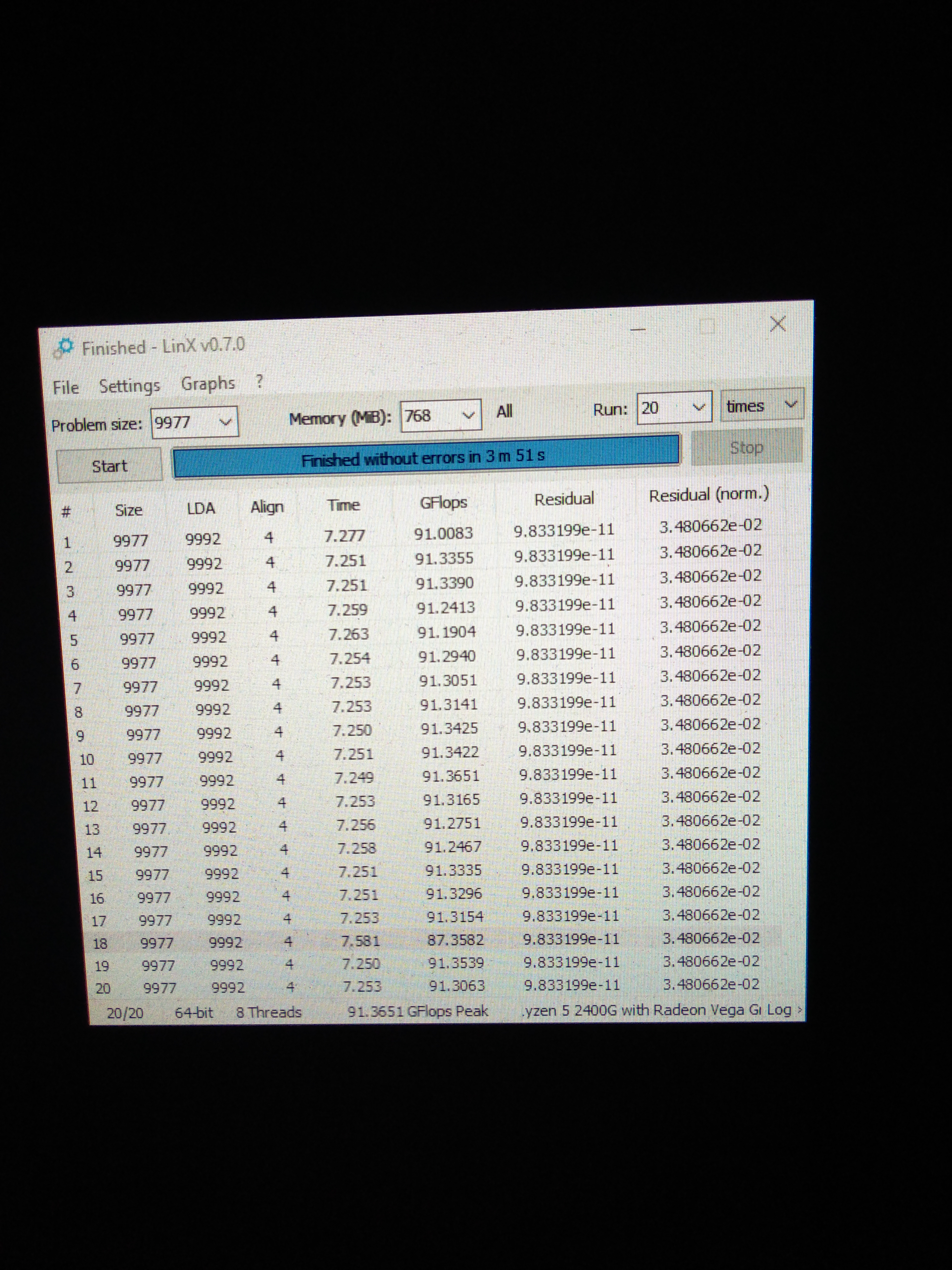 парни или кто вы там , вы прекратите уже тролировать весь честной форум, с линксом 0.7.0 всё в порядке, ставьте задачу хотя бы 6К или 8К, зачем вот это вот всё с 768 задачей? тут дело такое по невязкам - если они есть то или напряжение на камень низкое или с вашей памятью не всё в порядке , а ещё не надо во время теста сёрфить, записывать, делать скрины и другие телодвижения, нужно вообще потушить всё что висит в автозагрузке, вырубить антивирь и заблокировать интырнет, что бы ни что ни куда не щемилось , всякая активность в винде даёт вам невязки и ошибки .