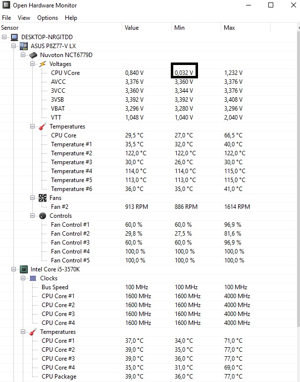 продолжение "банкета" в биосе просто выбрано повешенное быстродействие. прогнал осст, сделал скрин, отошёл на 20 минут хардвеар монитор работал, прихожу и вижу такие результаты в простое. Система работает стабильно. В простое тоже 99,9% показания датчиков нормальные а потом ловлю такой скачёк непонятно откуда. в нормальном режиме выставленном в биосе таких глюков не замечено.