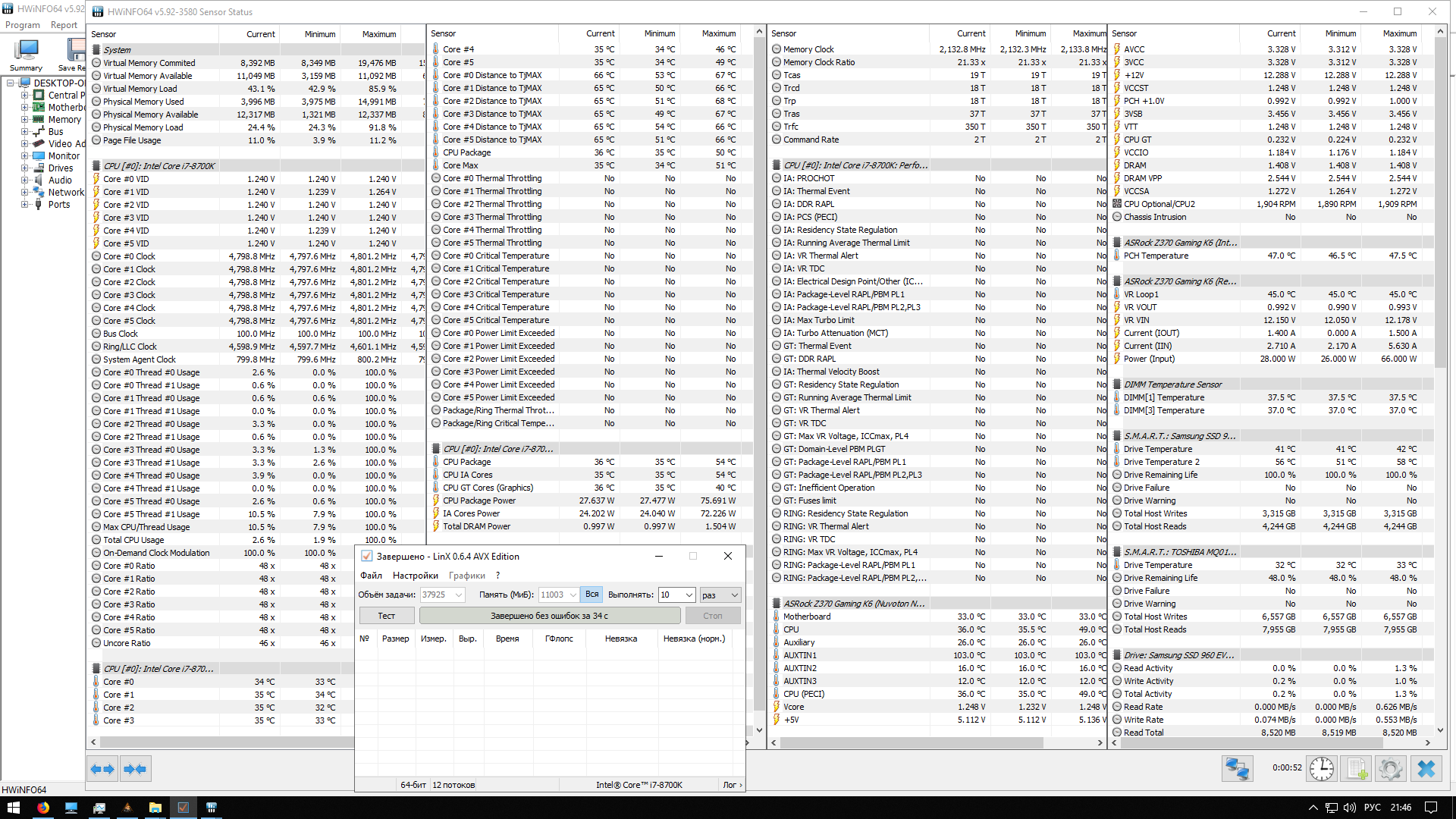 Полученный результат должен иметь следующий вид: Скриншот рабочего стола после прохождения >9 циклов (т.е. между 9 и 10 проходами). Вместе с LinX на рабочем столе должны быть развернуты CPU-Z (первая вкладка) и Core Temp, это обязательный минимум. Такой набор программ даст информацию о напряжении и температурах под нагрузкой-простоем. По желанию можете добавить другие программы, показывающие дополнительную информацию о вашей системе, например третью вкладку CPU-Z, которая покажет модель материнской платы и версию BIOS. Пример результата разгона: Mad Max, 5100 МГц (AVX 0), i7-8086K, HT-ON, Cache 4700, Vcore=1.36V, Batch L805E123, Gigabyte Z370 Aorus Gaming 7 (bios F6), Be Quiet! Dark Rock Pro 4, ЖМ под HS, Windows 10 Pro 64-bit 1809, LinX 0.9.3 64bit.