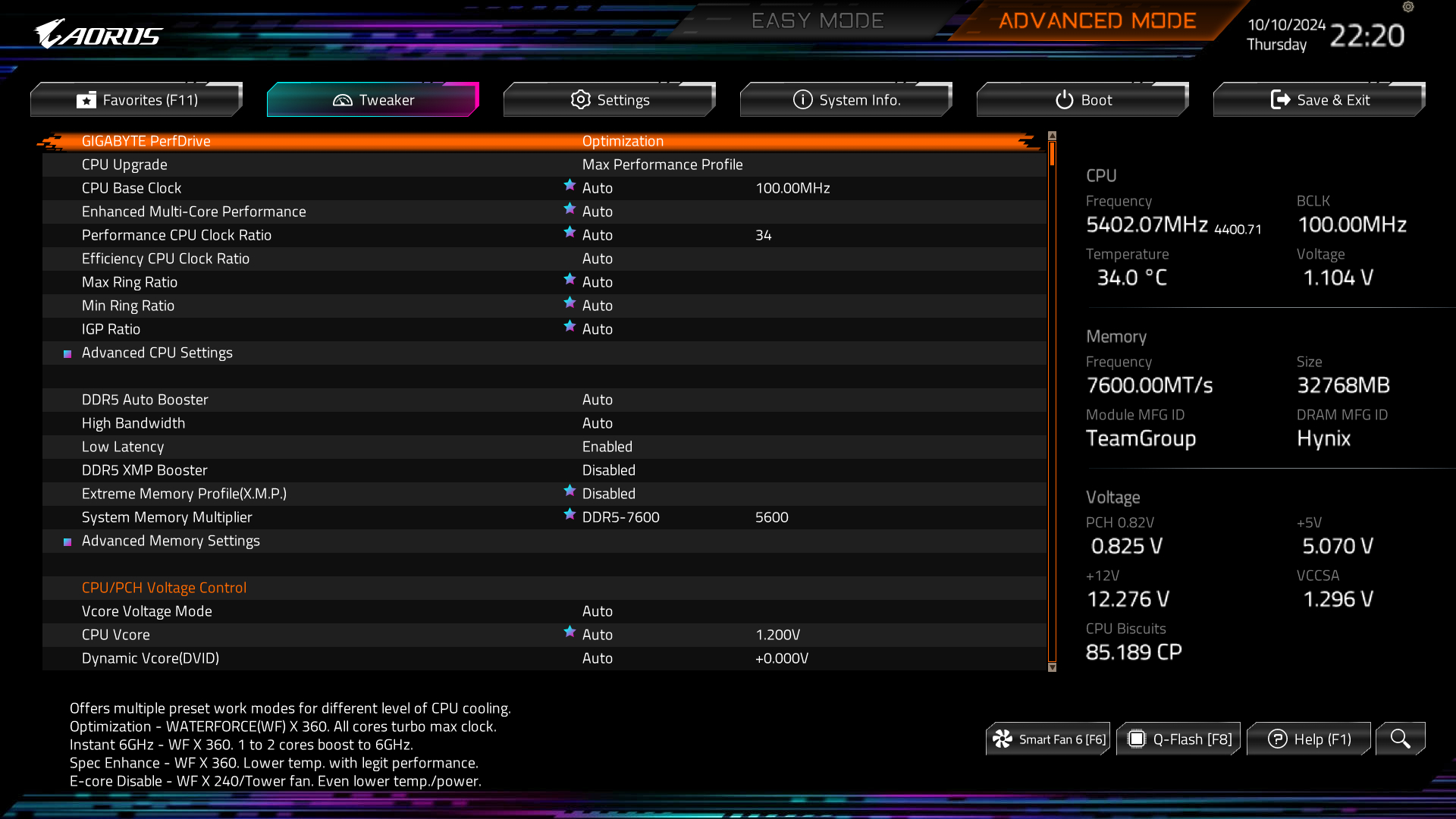 накатил я тут последний биос F15 после F12 "бисквит" проца уменьшился с 85.189 СР до 83.975 СР и максимальная частота Е ядер стала 4200 вместо 4400 настройки идентичные, профиль Max Peformance Profile