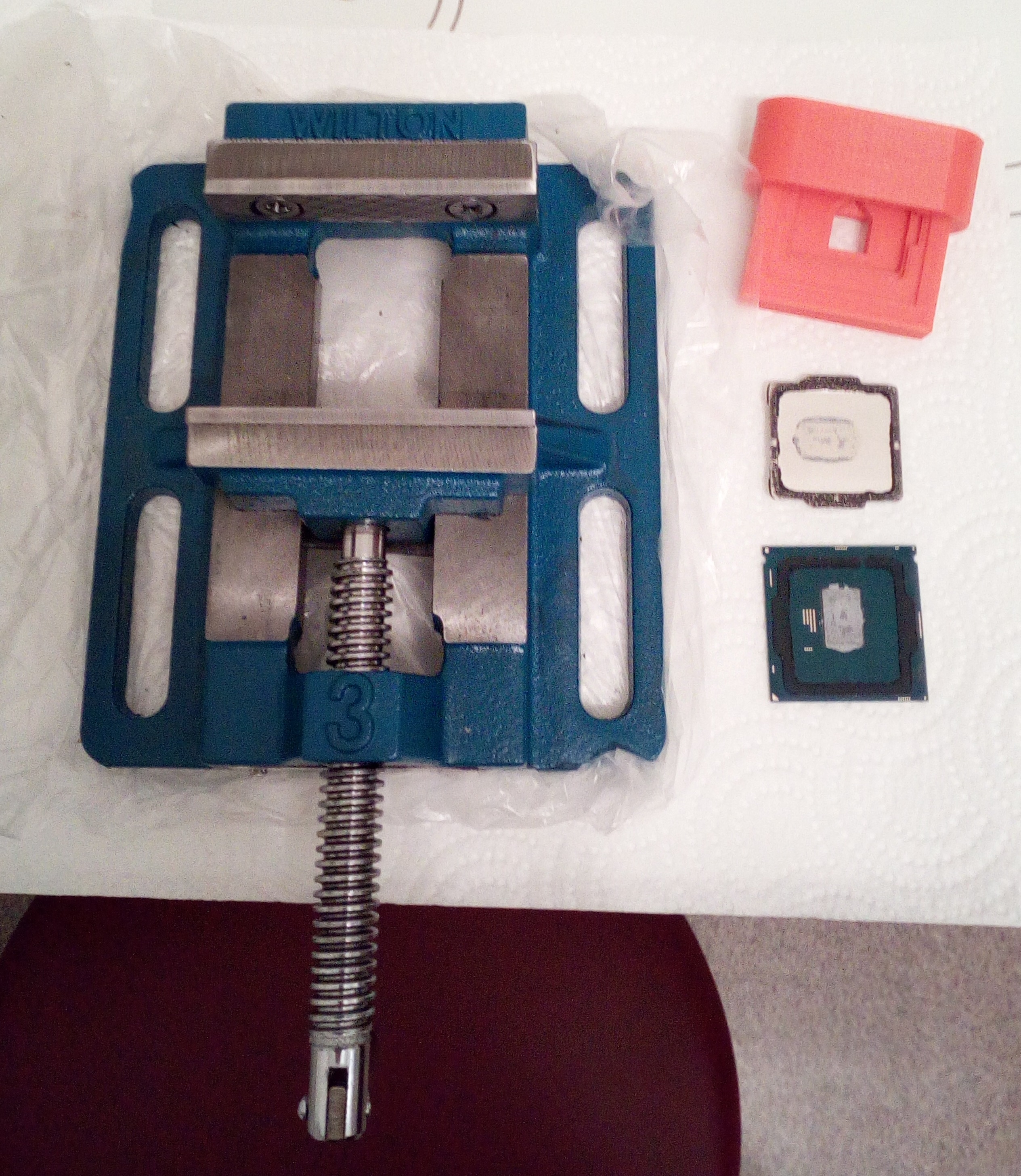Воодушевился прочтением поста vovamusic Да и решил скальпировать полученный сегодня QHQF I7 6400T. Как раз вечером доработал купленные тиски (губки на наждаке и притирочной пасте выровнял). Хотел подрезать лезвием, затупил его как делает BY_Pashka, попытался, входило в разрыв герметика очень туго, побоялся прикладывать усилие, отложил лезвие. А то свежи в памяти воспоминания о поврежденном текстолите. Включил газовую конфорку, прогрел до 85С, выключил и положил крышкой на неё проц. Прогрел градусов до 70, быстро снял, вставил в делид тоол, его в тиски, пол оборота ручки и готово Осмотрел место где лезвие вставить пытался, все нормально. В общем скальпировал успешно, собирать буду завтра, т.к. сейчас сокет занят сохнущим предыдущим процессором. По температурам не скажу, т.к. скальпировал даже не вставляя в сокет. Добавлю: собрал систему, проц работает нормально. Наконец-то полностью успешный скальп спустя 2 попытки)))