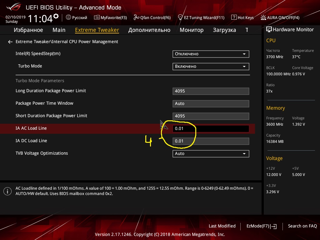 1. лимит по мощности, поставил максимум 2. обязательно минималку в авто чтоб напругой руководил сам проц от степени загрузки, а максималку как разгонится. 3. ну и сам адаптивный режим. VID+OFSET+LLC(IA AC/IA DC)=U 4. "точность" или "разброс", удержания лимитов напряжения и "ампеража" Кажется все, поправляйте если что не так. итог такой что и 5ггц на одно ядро идет. но это сугубо для самоудовлетворения, толку от такого турбо не заметил. сценарии где такое происходит не знаю даже, иногда конечно в режиме бездействия проскакивало но не на долго, чуть стоит нагрузке увеличится идет 2 ядро и сброс частот. под линксом 4.7 на 1.248 держит. и то у меня жвачка не менялась все заводское темпы под 95. осталось добить стабильность задающего генератора настроек много а что по чем пока ни кто не разъяснил.