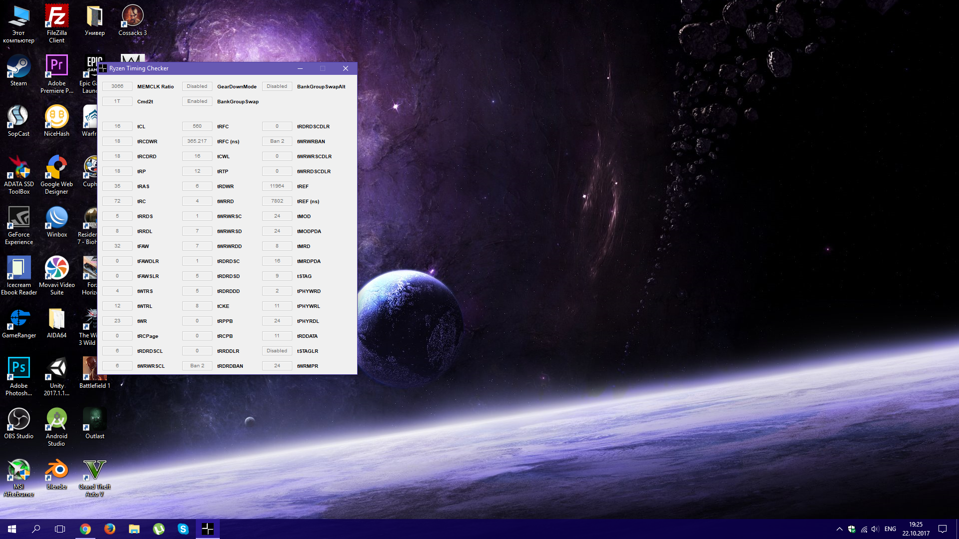 Думаю это окончательный разгон. 3200 никак не поддаются. Но для Hynix 3066 тоже неплохо. Вот результат: VCore SoC: 1.1 DRAM Voltage: 1.37(мамка 1.38 ставит почему-то) CLDO_VDDP: auto CAD_BUS: 24-24-40-120 ProcODT: 53.3 RTT: RZQ/4, RZQ/3, RZQ/3 Тайминги