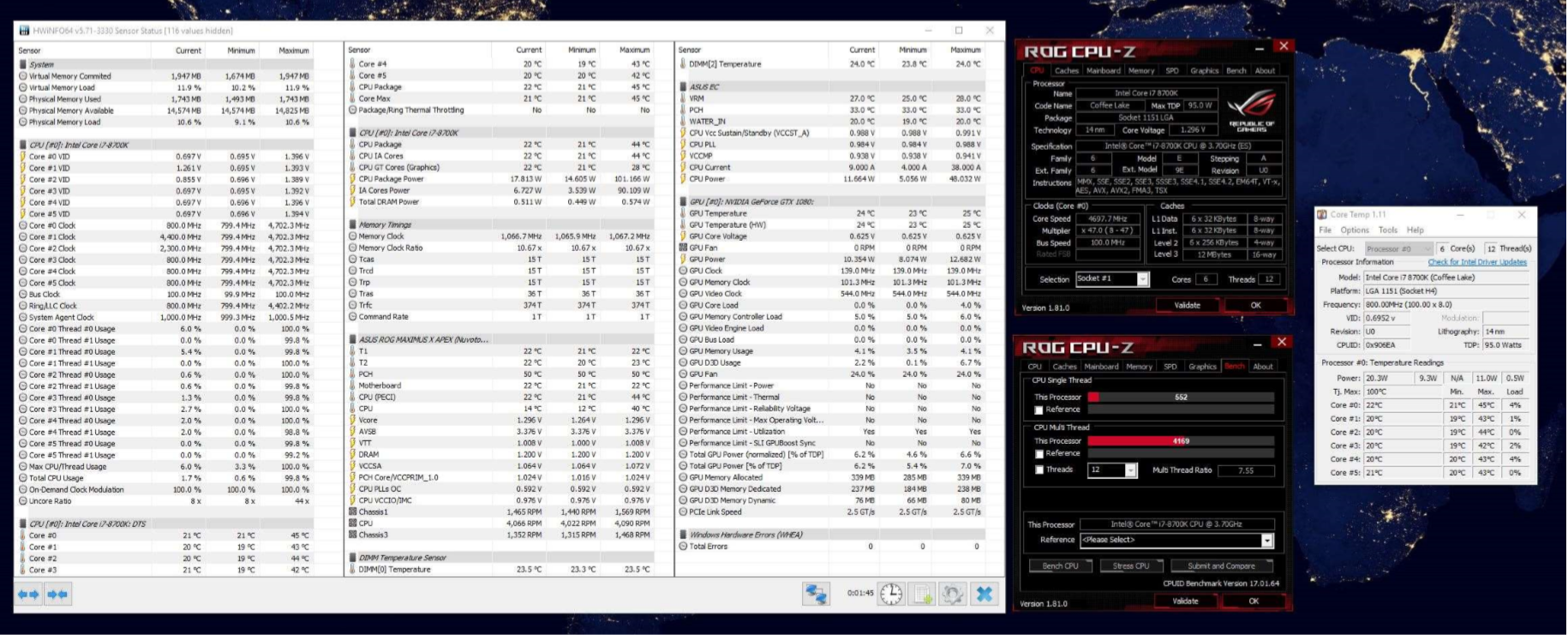 Coffee Lake Basic Overclocking Guide. The Coffee-Lake generation of processors represent a welcome (up to) 6-core family of parts with excellent IPC, z270-class memory controller and very good overclocking capability. Many 8700Ks run 5.0GHz and 4000+ ram speeds with little fuss. There is one design aspect that you either fix or live with and that is the TIM used at the die-IHS interfaced. In stock form the 8700K is a great 6 core cpu but can suffer from elevated temperatures. So, if you want to run 5+ GHz on this SKU, you’ll want to delid the CPU and replace Intel’s stock TIM with a liquid metal. Delided CPUs run 20+C cooler on average and as a result, usually overclock higher. Most delided 8700K can run 5.0GHz at less than 1.4V. Equipment used: ASUS Maximus X Apex Intel 8700K G.Skill 2x8GB 4400c19 ram kit (excellent B-die kit) Seasonic Prime 1000W PSU ASUS GTX 1080 Turbo Intel 750 SSD Koolance 380i CPU Water block Bitpower Full Cover GPU Water block GPU and CPU are cooled with a custom water loop (1x360 rad, 3 fans), the CPU is delidded with CLP between the die and IHS. Software: CPUZ HWiNFO64 SIV64 CoreTemp Real Bench There are two basic modes for overclocking for 24/7 use: Manual Override or fixed Vcore, and dynamically link voltage and frequency (Adaptive or Offset). Of course, each of these can be tuned for a specific user need or application, but let’s just get the basics down first. Ideally, we identify the voltages needed for an OC using Manual Override, then if/when desired, use this knowledge to set Adaptive voltage. A few assumptions: 1. The idea is to find the sweetspot for your combination of components. 2. Vdroop is a good thing. Settings shown here allow for a modest amount of droop on the voltage rail LLC is acting upon, which is vcore for Z370. 3. Acceptable load temperature is at least 20C lower than the throttling temperature. We do not want the part slamming into the temperature ceiling, especially when running vcore higher than stock. 4. CPU degradation is cause by many factors, the principal causes are current, voltage and temperature in combination… all the things we do to overclock a CPU 5. Overclocking is always ‘at risk”. So… let’s begin by finding a manual override OC on an 8700K which gives us a base to work. System is set up, windows loaded, all drivers are loaded, cooling is in place and the system will boot into windows with all default settings (XMP is not a Default setting). It’s always a good idea at this point to make an Image of your boot drive(s). The built-in Win 7 imager works fine, or use the backup software you prefer. The main thing is to have a good system image to “deploy” should things go horribly wrong (very unlikely if you do this with patience). Step 1 • Clrcmos • Check your boot priorities, F10 to save and reboot. • Let the system boot into windows. • Open two instances of CPUZ and your favorite temperature monitoring software (such as CoreTemp, HWiNFO64, SIV64, AID64, etc) • In one instance of CPUZ switch to the Bench tab and run the CPUZ Bench. Note (write down) the vcore reported. Note the highest core temperatures reported. You can see from the picture below, this CPU uses 1.28V at default settings to achieve a 4.6-ish frequency on all cores. Temperatures are excellent.