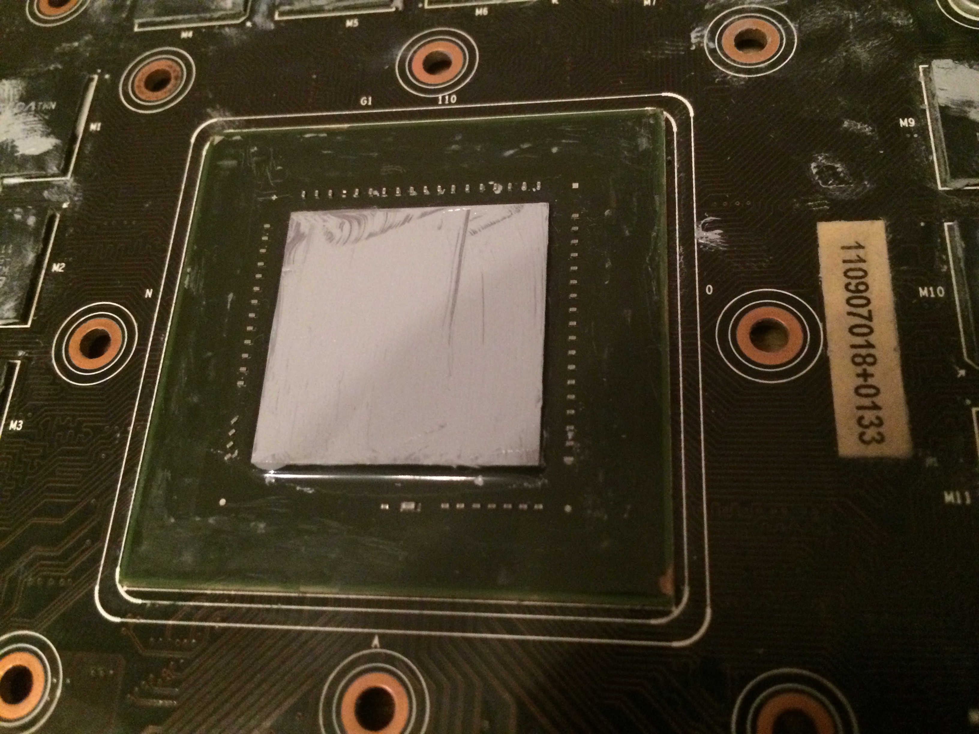 В общем, как я не извратился с крышкой, лучше не стало - слегка отшлифовал плоскоть, приклеиваемую к чипу (на фото), по линейке проверил плоскости как и советовали - да вроде ровная, пасты нанес минимум - отпечаток есть. Герметик нанес только по углам, выждал час под грузом, накинул кулер - температуры взлетают даже сильнее на нештатном охлаждении, чем при предыдущей попытке. Остается только бахнуть побольше пасты, как было с завода)) если не получится ничего - попробую найти пластину медную и припаять к площадке штатного радиатора, чтобы обойтись без крышки, опять же. Других мыслей уже нет...
