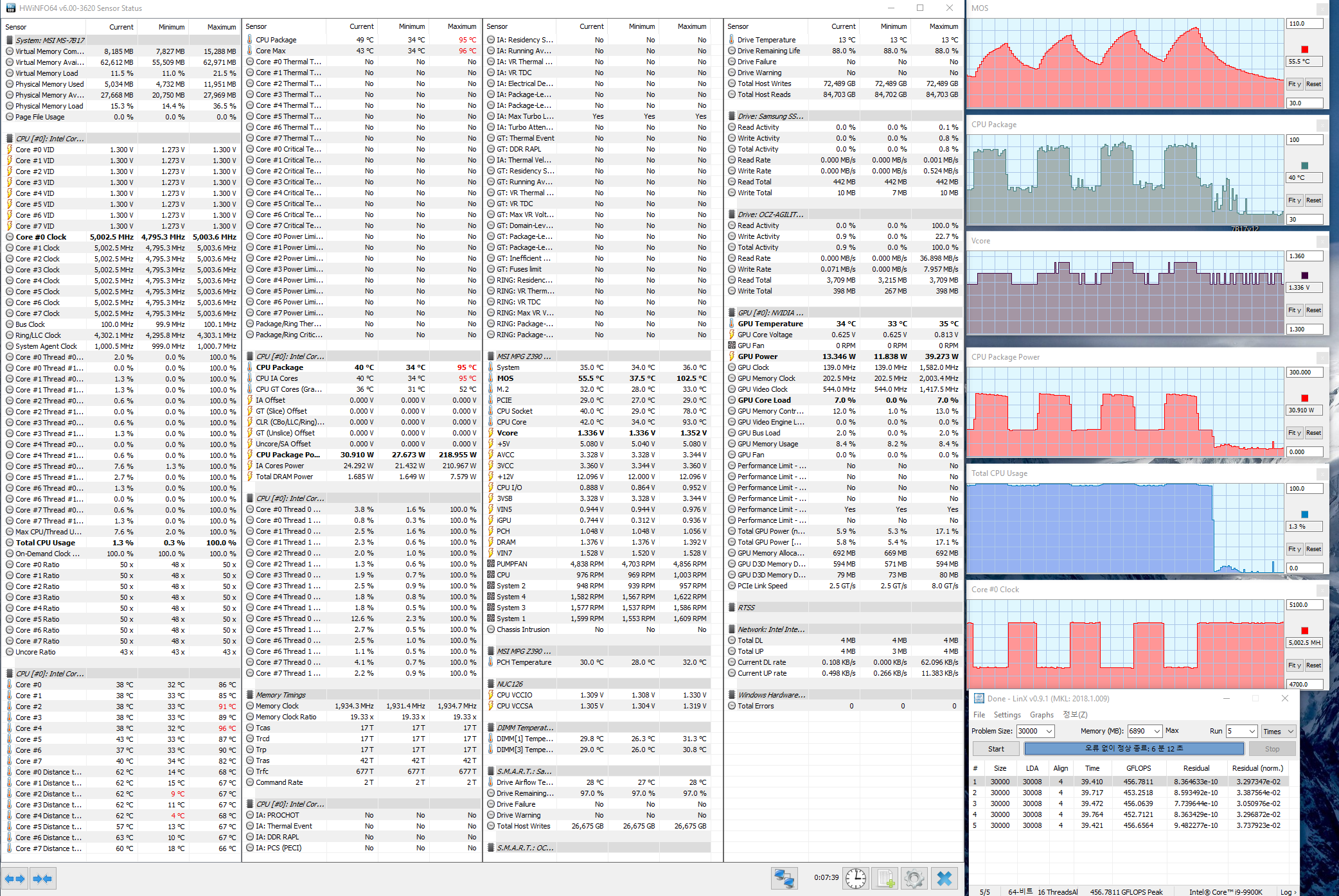 Полученный результат должен иметь следующий вид: Скриншот рабочего стола после прохождения >9 циклов (т.е. между 9 и 10 проходами). Вместе с LinX на рабочем столе должны быть развернуты CPU-Z (первая вкладка) и Core Temp, это обязательный минимум. Такой набор программ даст информацию о напряжении и температурах под нагрузкой-простоем. По желанию можете добавить другие программы, показывающие дополнительную информацию о вашей системе, например третью вкладку CPU-Z, которая покажет модель материнской платы и версию BIOS. Пример результата разгона: Mad Max, 5100 МГц (AVX 0), i7-8086K, HT-ON, Cache 4700, Vcore=1.36V, Batch L805E123, Gigabyte Z370 Aorus Gaming 7 (bios F6), Be Quiet! Dark Rock Pro 4, ЖМ под HS, Windows 10 Pro 64-bit 1809, LinX 0.9.3 64bit.