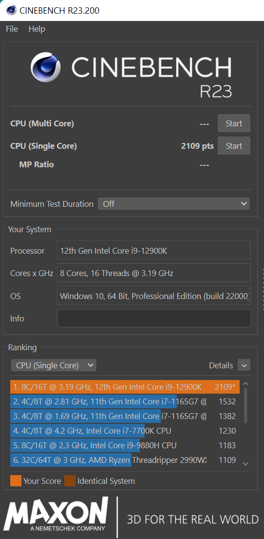 Спасибо за видосы. 5.6ghz мой проц не покорил, при загрузки винды стабильный бсод, а вот 5.5ghz на двух ядрах работает отлично, остальные пока ещё не проверил. Вот результаты Cinebench в однопотоке на 5.5ghz у 1 ядра и 4.9 у остальных. Энергоэффективные ядра и HT не отключал. Энергопотребление в таком тесте было маленьким, 150w, а температуры не превысили 70 градусов.