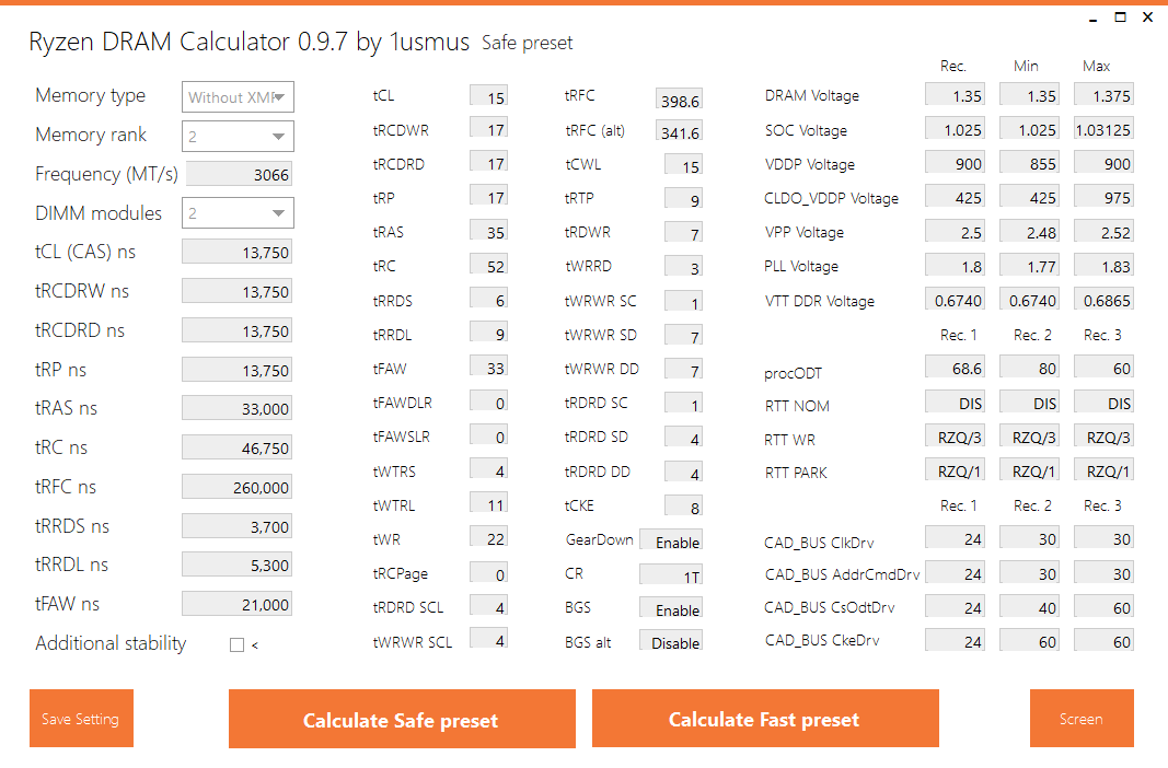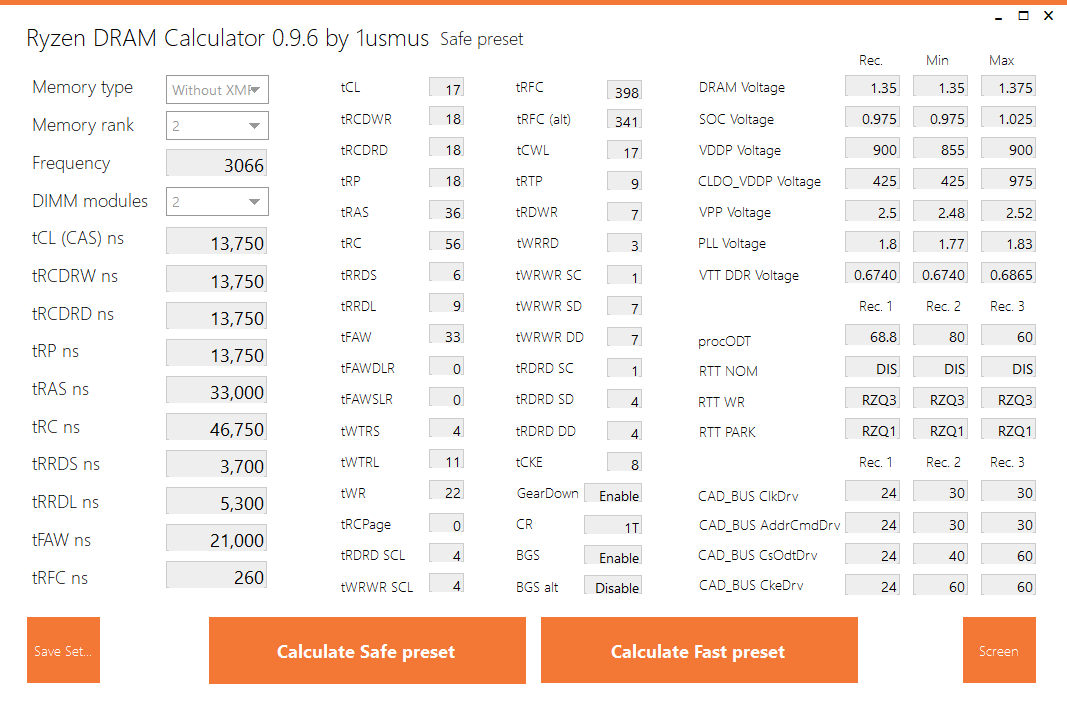 Шаг 5: Выбираем в калькуляторе тип нашей памяти "Memory type" , UHQ это Samsung b-die с XMP профилем; HQ это микроны, хьюниксы и другая память которая поддерживает XMP профиль; Without XMP это любая память у которой нет XMP профиля. Где можно узнать тип памяти? - в шаге 1. Manufacturer Samsung и B-die (20 nm) / 1 die . Затем выбираем ранг нашей памяти, тоже можно найти в шаге 1 Organization 2048M x64 (2 ranks) . И последнее что нужно сделать - выбрать частоту на которую мы будем разгонять ( в поле Frequency (MT/s) вписываем наше пожелание ) Шаг 6: Жмем Calculate Safe preset или Calculate Fast preset Шаг 7: Полученные данные сохраняем кнопочкой "Screen" и идем в биос устанавливать наши настройки