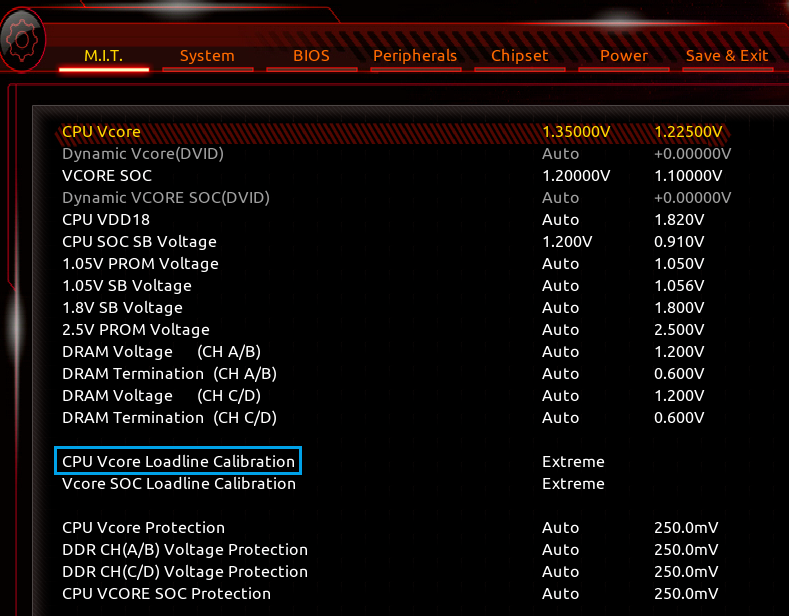 "CPU Vcore Loadline Calibration" во вкладке "M.I.T." в биосе?