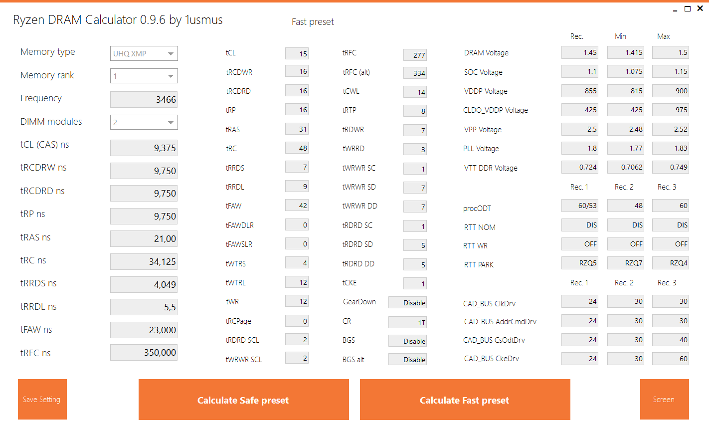 Напряжения: CPU - 1.2875V, SOC - 1.05V, DRAM - 1,4V 3466мгц 16-20-18-18-40-60-450 1Т, все остальные тайминги из сейф пресета tRC и tRFC опять взяты с гугл калькулятора, программные 39 и 59 не работали стабильно