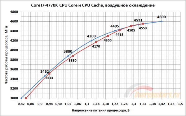 С какого перепуга? Каждый проц индивидуален. Есть просто факт по разнице вольтажей CPU и Cache ~0.06 V (d плюс к кешу на одинаковых частотах ядер и кэша)