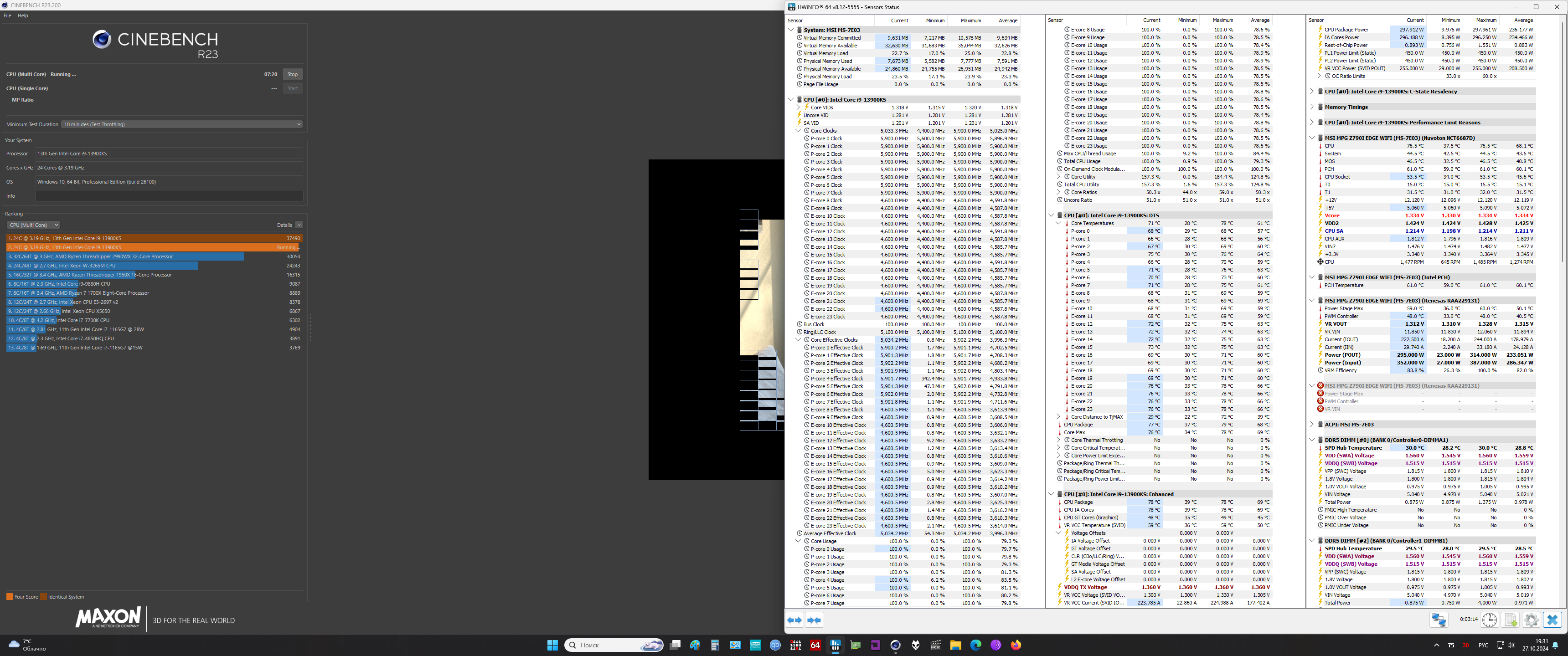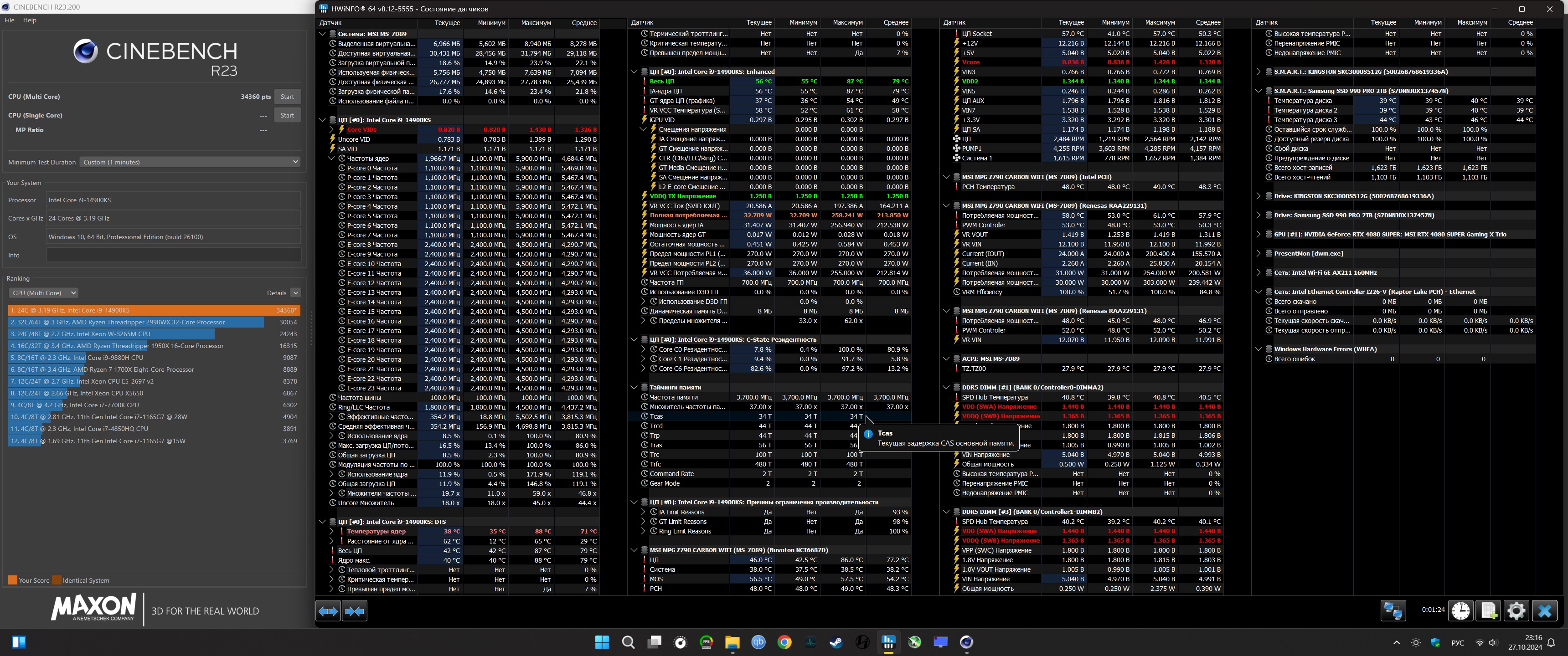 У него троттлинг по току, судя по всему. Оно и неудивительно с таким напряжением. P.S. Я на воздухе набираю 40300. Соглашусь со стоком и 40к. В целом не имеет особого смысла выше 1.32 напругу поднимать, т.к. там уже за 400А по току выйдет, что приводит к нехорошим последствиям для 13900/14900k.