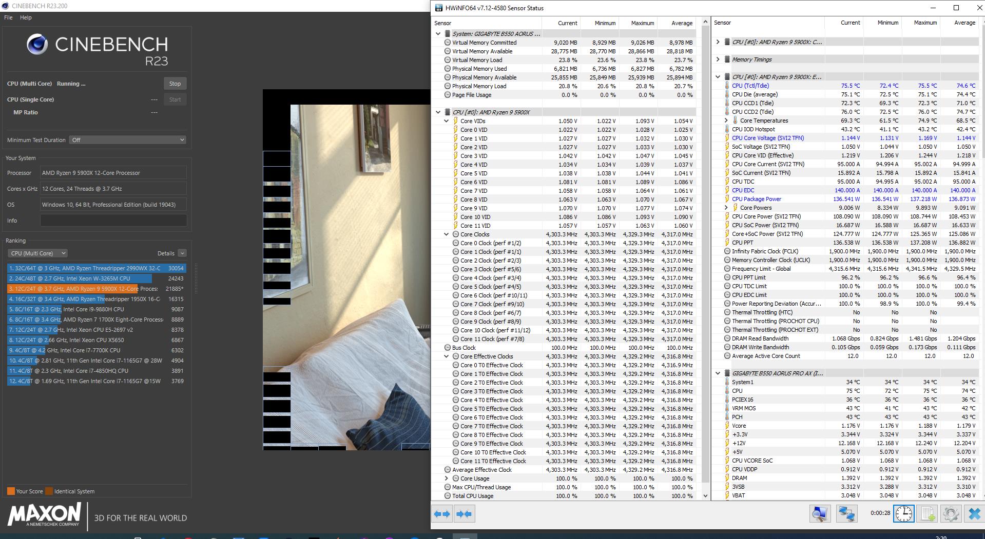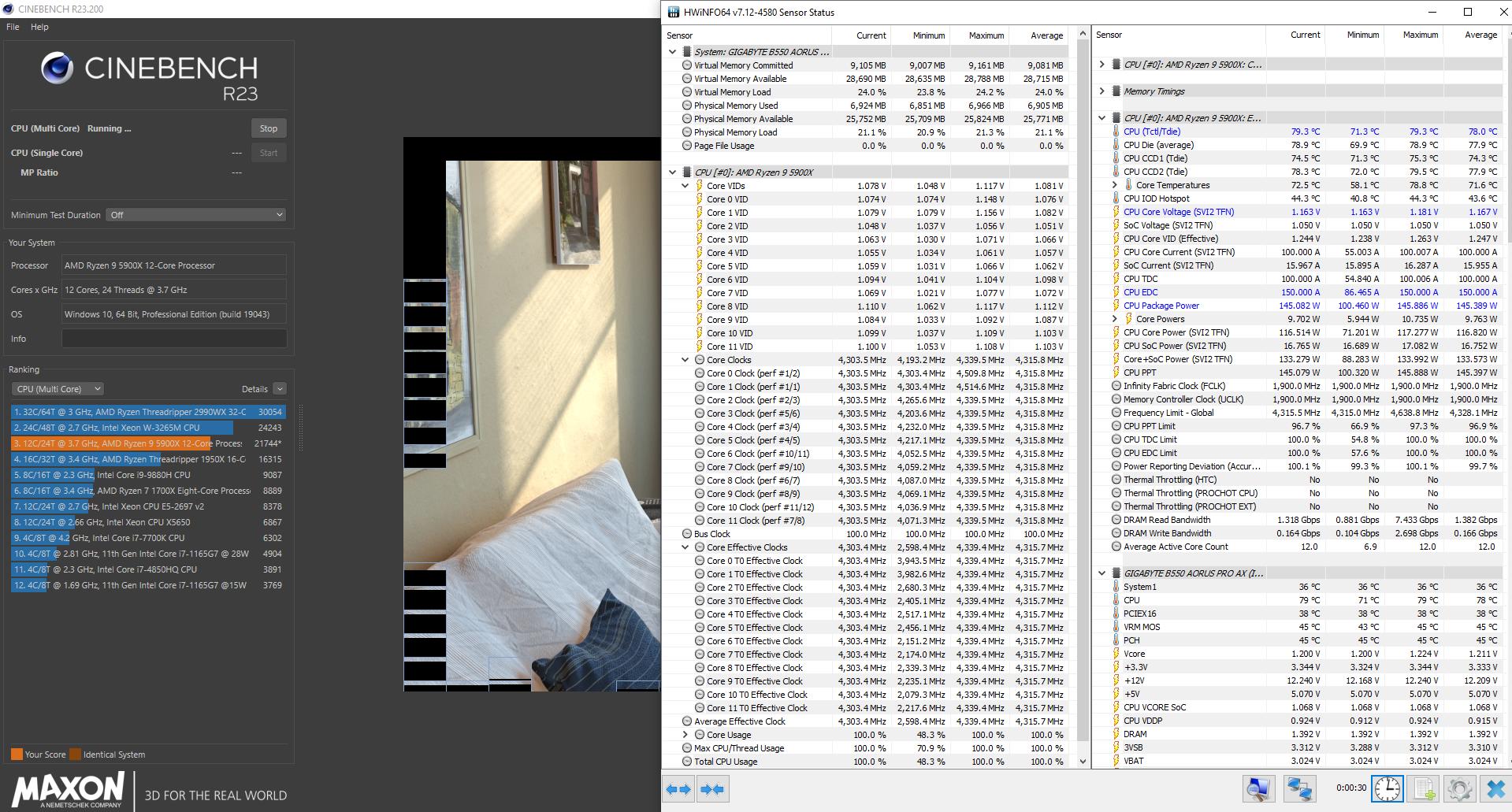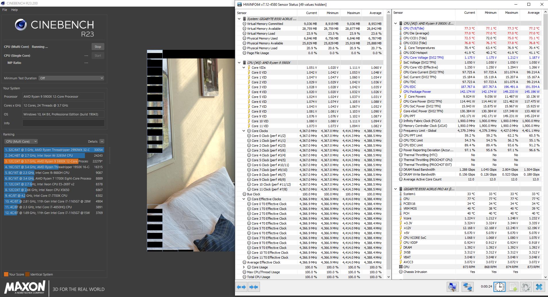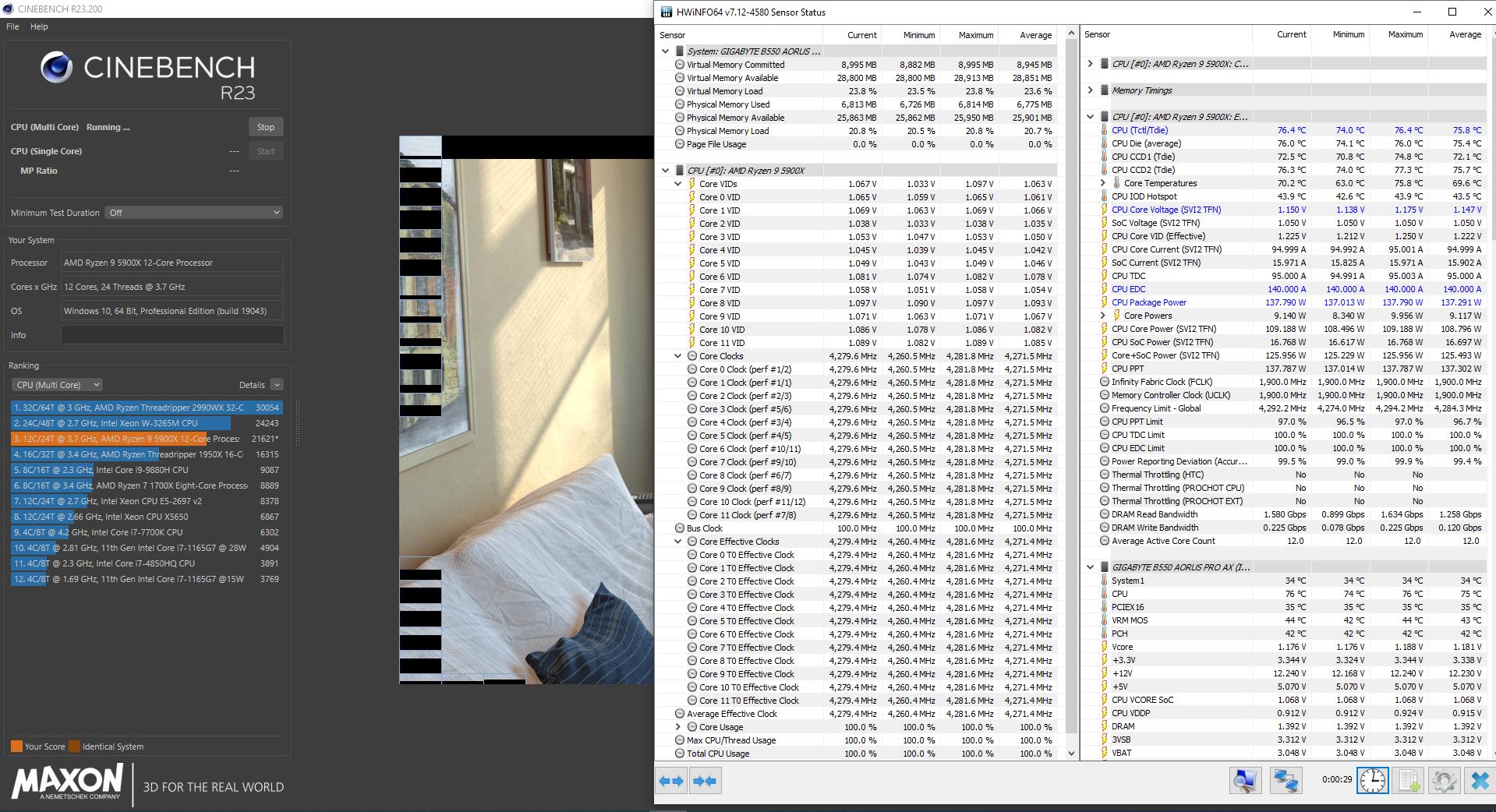 Мой процессор при лимите 77C и на четверть больших лимитах потребления, чем те которые указаны здесь, гонится так-же как у immortal3000, на кастом воде. Но если воздух тихий то разгон может падать под нагрузкой на 3-7%, за 10-15 минут. Из-за прогрева жидкости в СО. Если сделать громко, то меньше. Пиковые результаты, на первых проходах CB23 ~29.5K. Больше просто не гнал. Без надобности. Итоговый лимит оставил 74C 160W (5950x).