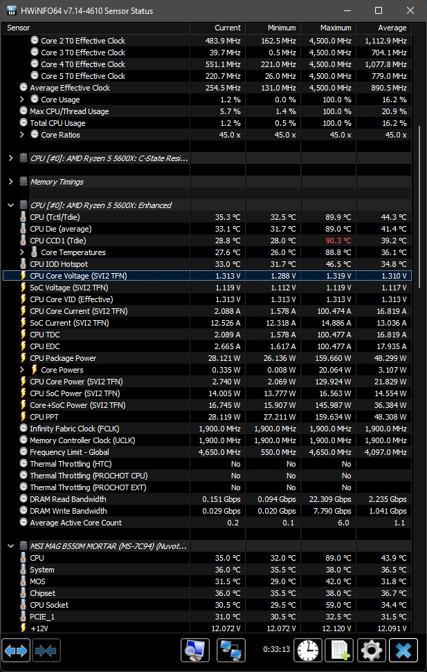 CO минимум TDC/EDC/PPT 180/210/240 (примерные значения около максимума, для 5900, можно и больше, но мониторь что-бы VRM не грелся больше 70-75С) TL 77C LLC минимум или авто Infinity Fabric больше 1800 не разгонять при подборе, потом как хочешь. Вторички памяти не разгонять, до подбора всех напряжений CPU. Vcore offset в минус не сильнее -0.005. Если CO достигли -30. При меньших значениях процессор сильно сбрасывает частоты в многопотоке. Vsoc offset в минус не сильнее -0.15, с -0.05 может падать производительность в многопоточном бенче AVX OCCT, мониторь. Подбор в сторону уменьшения напряжения, вторичных напряжений "CPU VDD18", "PM_1VSOC", "PM_1V8" может прибавить к производительности от трети до половины того что даёт настройка CO. Т.е, например настроишь 23K в CB23, со вторичными напряжениями будет 23500-24000. Напряжения "CPU VDDP", "PM_CLDO12" с большой вероятностью лучше не трогать. Лично у меня даже минимальная их настройка на уменьшение приводит к нестабильности. Те напряжение которые можно уменьшать скорее всего будут загружать Windows даже на минимальных значениях, но стабильные значения будут примерно около половины от минимума до стока. Сколько надо тестировать.