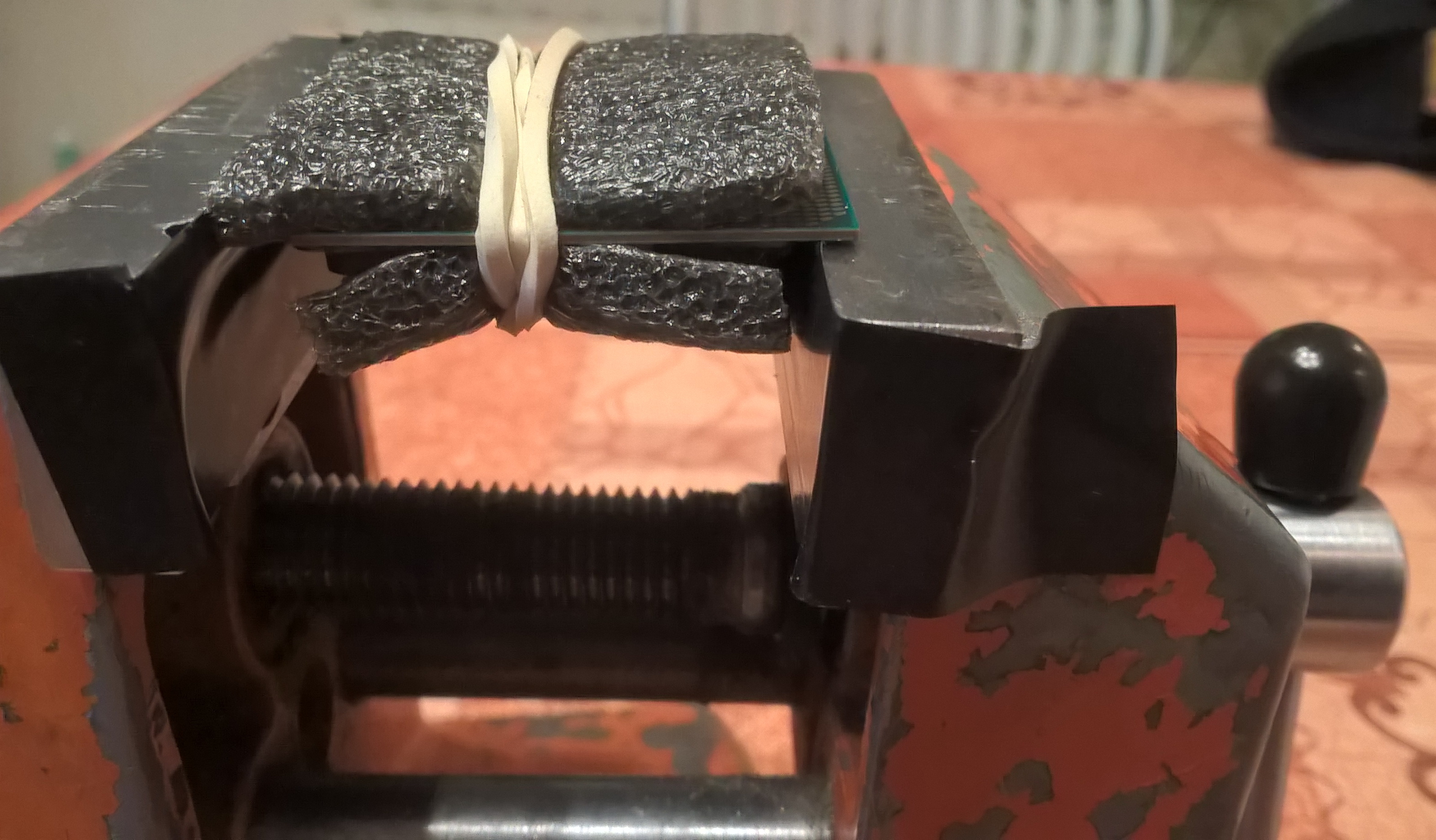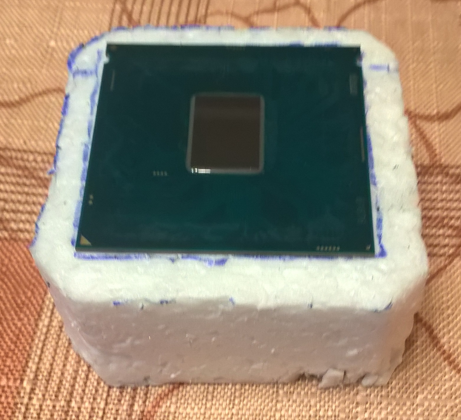 Вот и мой i5-6600K получил подарок на 23 февраля, в виде ЖМ Liquid Pro под крышку! Решил сделать сам, с помощью "древнего" тискового метода, и получилось! Для облегчения процедуры очистки подложки от остатков герметика, и для последующего приклеивания крышки без риска повреждения навесных элементов снизу подложки ЦП, за пару минут сделал простейшее приспособление из пенопласта. Сушил приклеенную крышку на этой же подставке под грузом 200г, предварительно прижав руками с бОльшим усилием. В результате измеренный штангенциркулем размер ЦП по высоте не отличается от первоначального - у моего 4,3мм. По результатам первых опытов обновлённого ЦП могу лишь подтвердить очевидный положительный эффект - существенное снижение температуры ядер (в тестах при потребления ЦП порядка 90...104 Вт снижение Tj макс. на 15...17°С !). Поменьше стал и разброс Tj макс. между ядрами. Использовал герметик Permatex Blue RTV (синий выбрал специально - чтобы "тюнингованный" ЦП отличался от "простого" ).